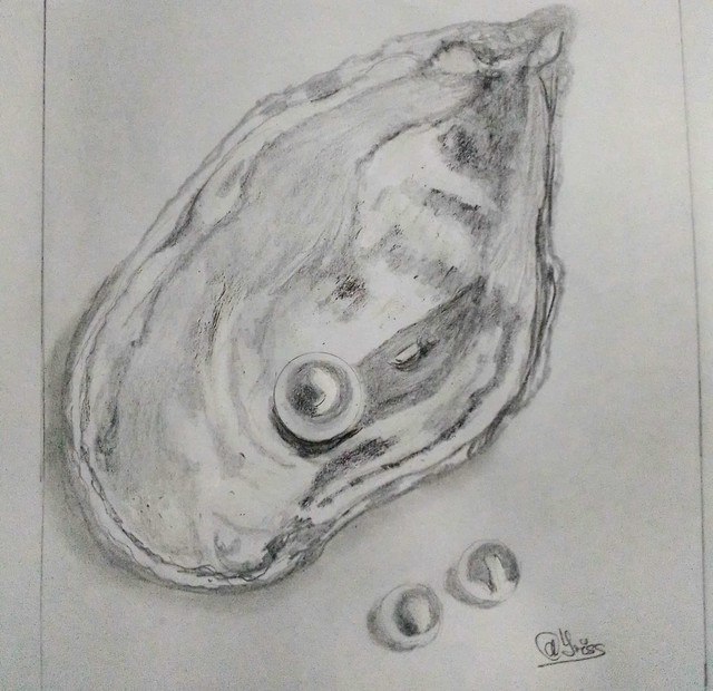 "With charcoal pencils, I aim each time to focus a bit of realism in my illustrations, today with some pearls in an oyster shell and others outside of them."
