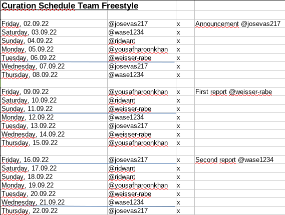 As you can see, we didn't follow a fixed weekly schedule, but continuously re-arranged our appointments. On the one hand, this gave us the flexibility we needed to fit the time-consuming research work into our normal daily routine. On the other hand, according to my impression, we were spared the situation where certain team members were specifically written to or mentioned, where posts were written especially for presumably well-meaning curators... To me, this seems to be an advantageous procedure; justice was maintained right up to the end as far as the distribution of responsibilities is concerned. I have to thank the whole team for the fact that the cooperation always worked despite time differences, language barriers and technical obstacles!