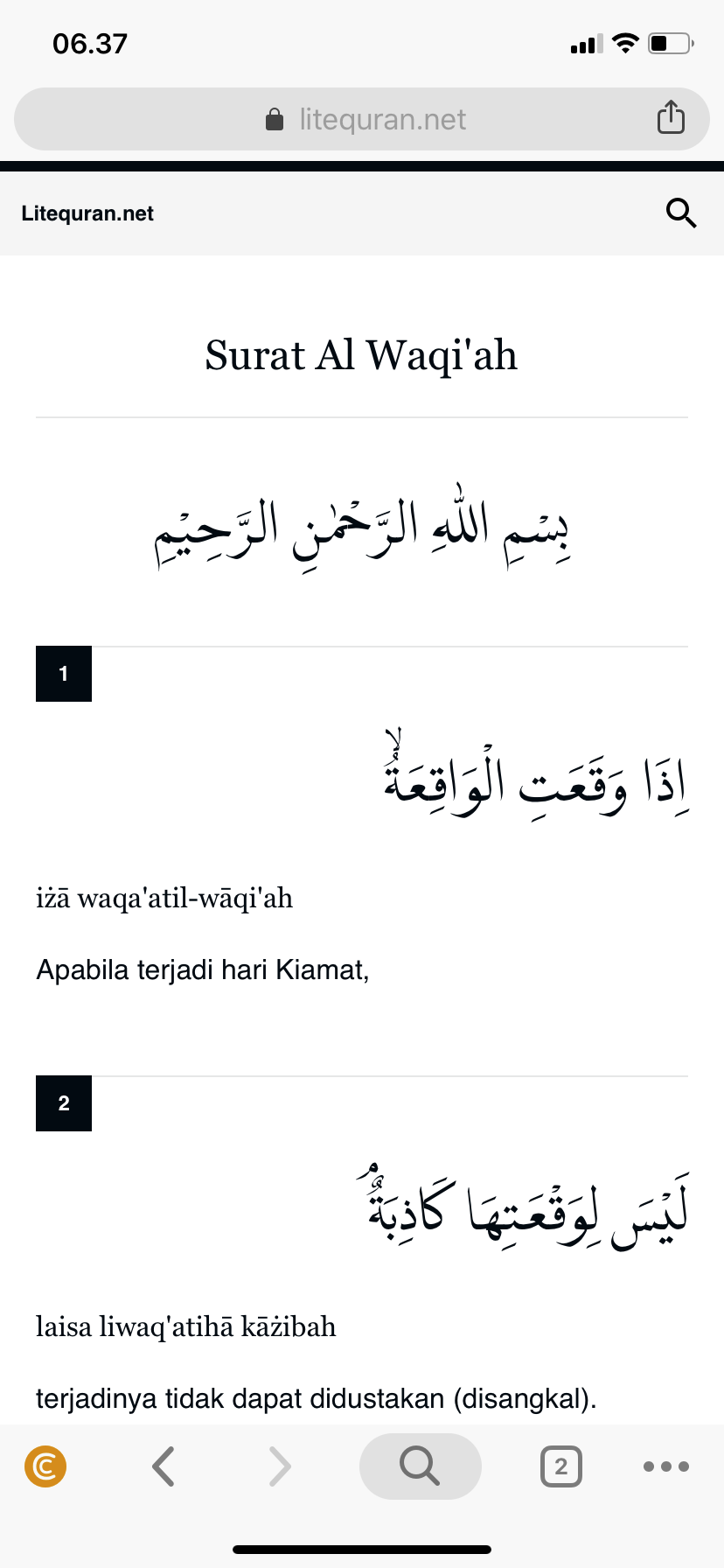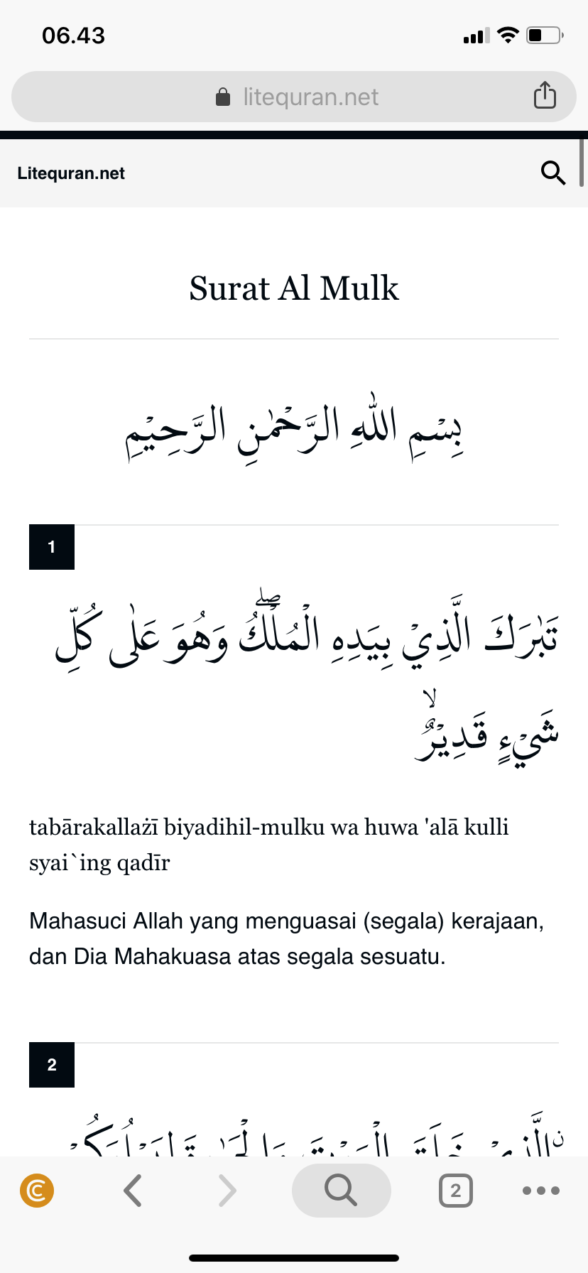 Lanjut setelah membaca Al-Waqiah, saya melanjutkan untuk membaca Al-Mulk, masih dengan ponsel.