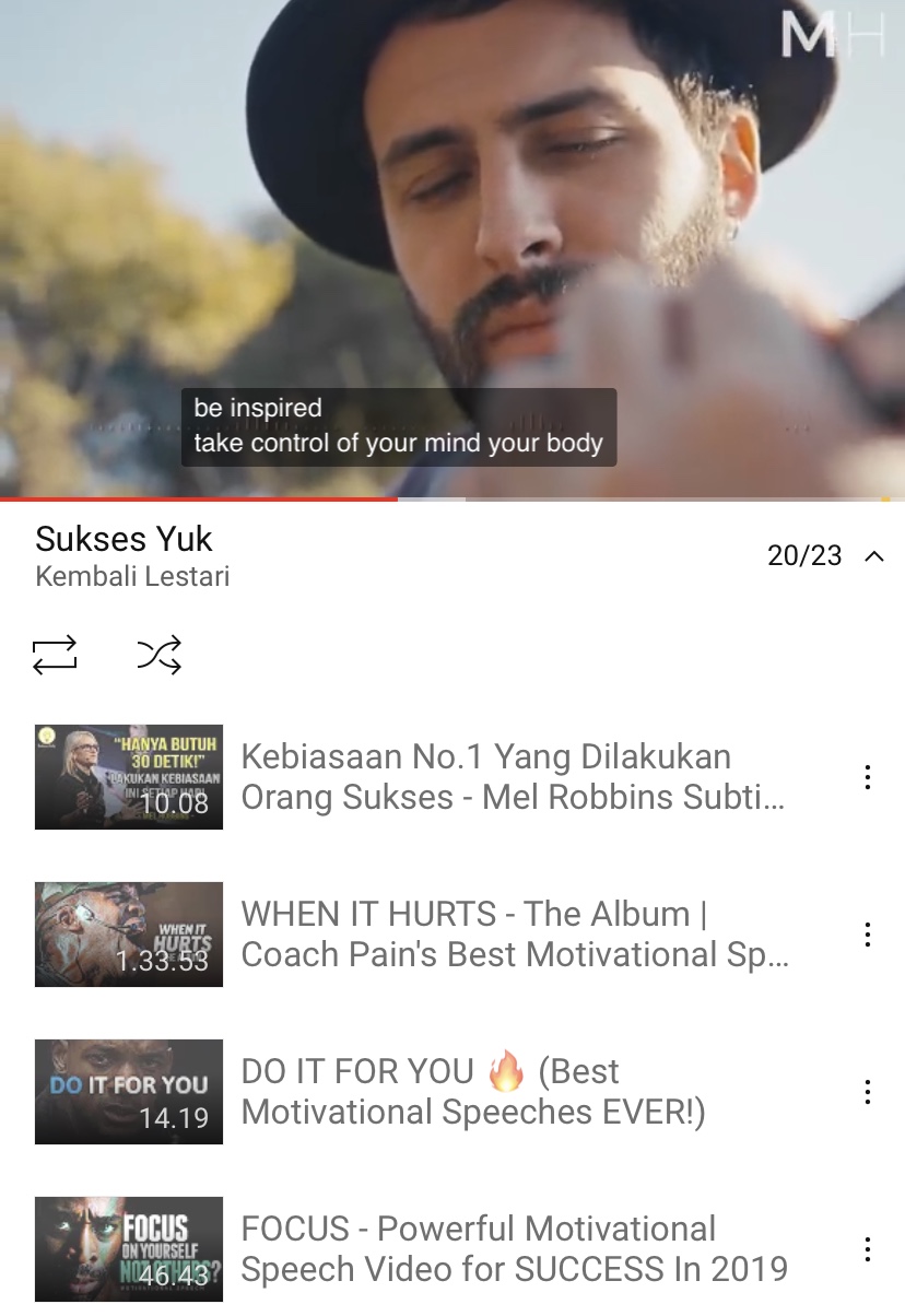 Sambil memandang ke langit dan berjalan-jalan sedikit, saya mendengarkan playlist di Youtube tentang motivasi. Saya rutin mendengarkan hal ini setiap pagi setelah bangun tidur, atau pada malam hari sebelum pergi tidur.