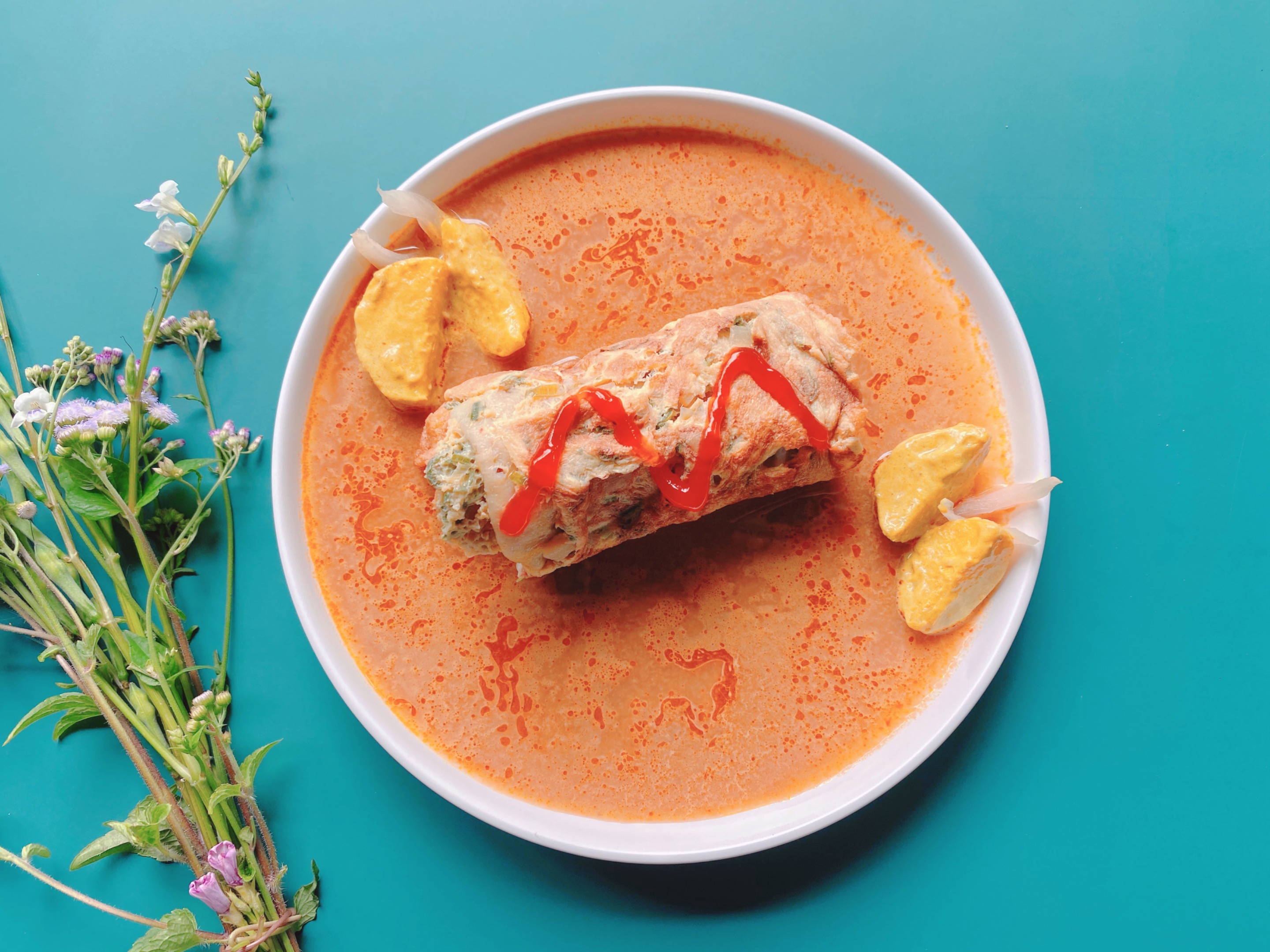Martabak telur saya hias di piring dengan penambahan kuah kari, dan sedikit kentang dan juga beberapa potongan bawang. Saya suka bereksperimen dengan menghias makanan-makanan yang sederhana dan kemudian itu tugas saya untuk membuat makanan itu terlihat menjadi berbeda dan menggiurkan selera.