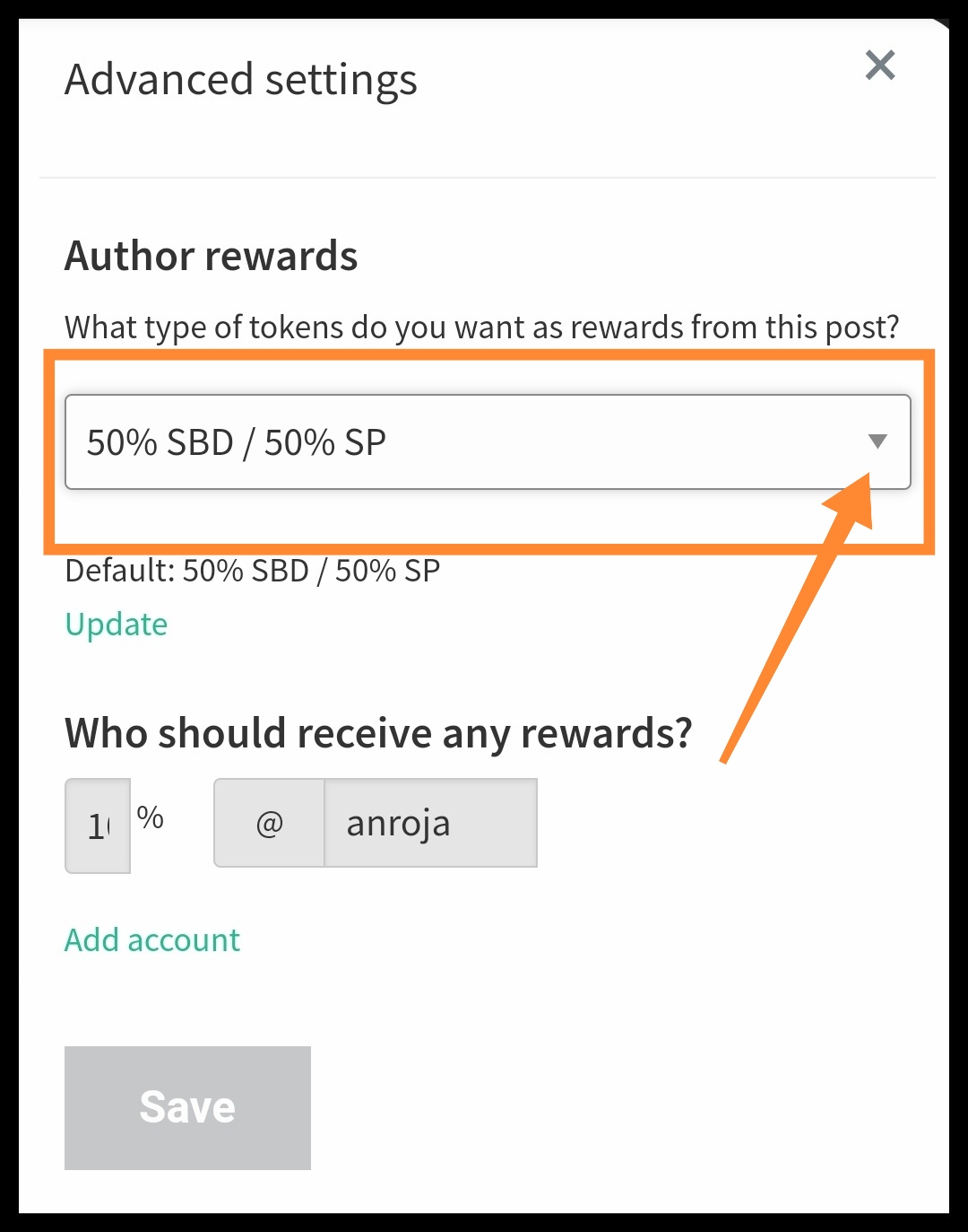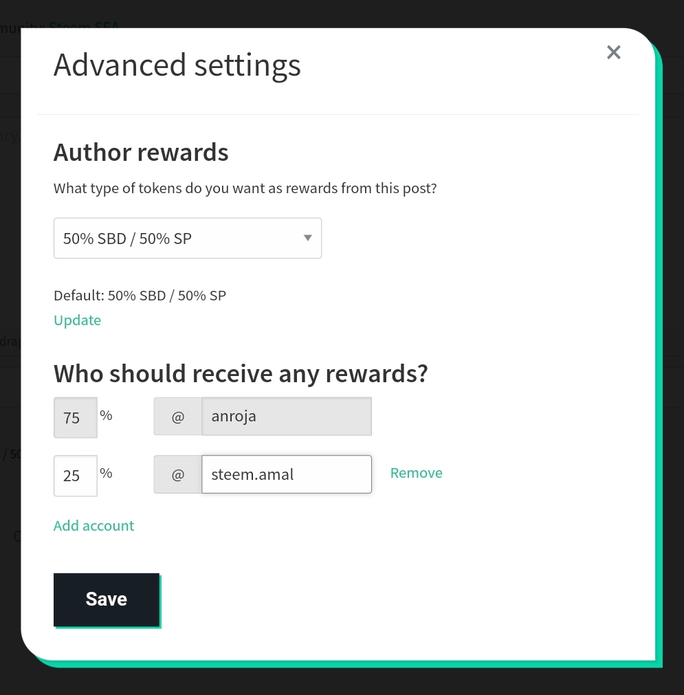Kemudian klik Add account dan pada kolom kedua sebelah kiri tambahkan jumlah persentase reward yang akan Anda atur, pada kolom kedua sebelah kanan Anda masukkan akun penerima manfaat (steem.amal), dan klik Save.