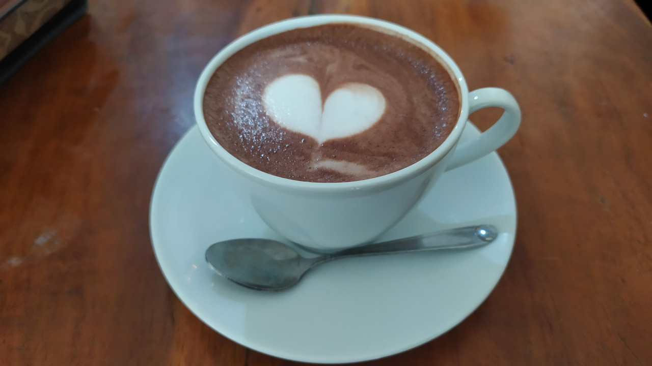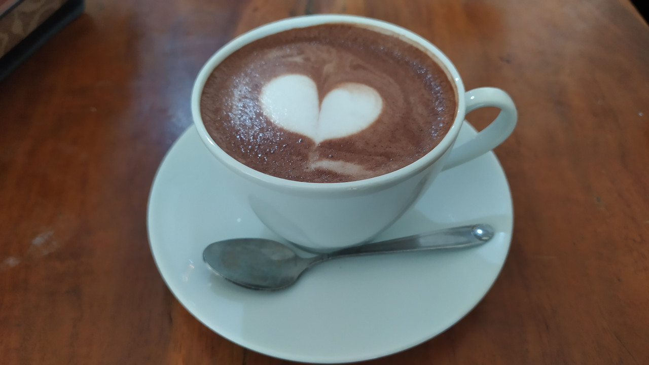 Minuman coklat di cafe ini sangat indah dan artistik, susu cair yang dibubuhi dihias berbentuk tanda cinta yaitu love putih yang indah.