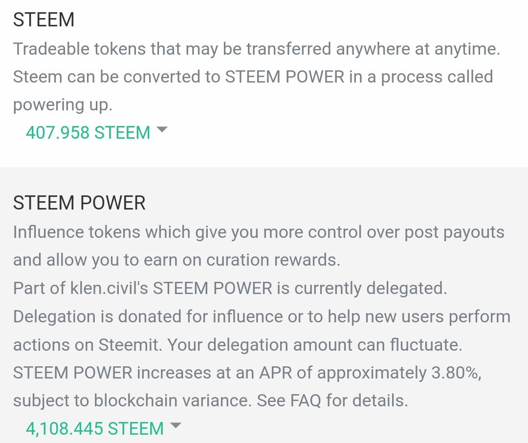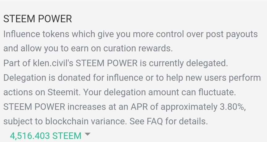 With the addition of 400 steem, the total becomes more than 4.5K steem power on my current account. My target this year is 15K steem power, and hopefully I can continue to do power ups. My thanks to all steemians who have supported me at this time.