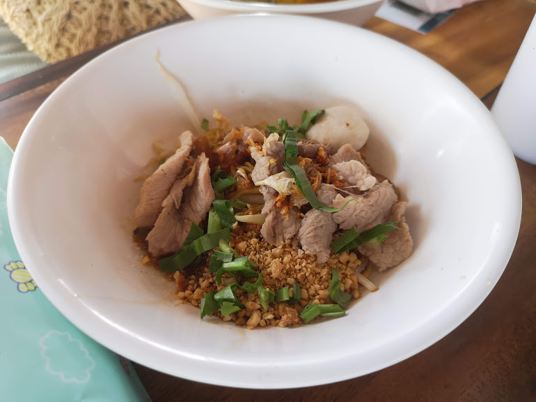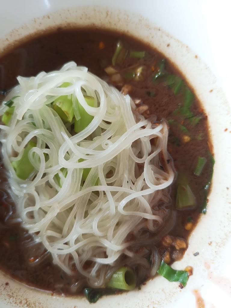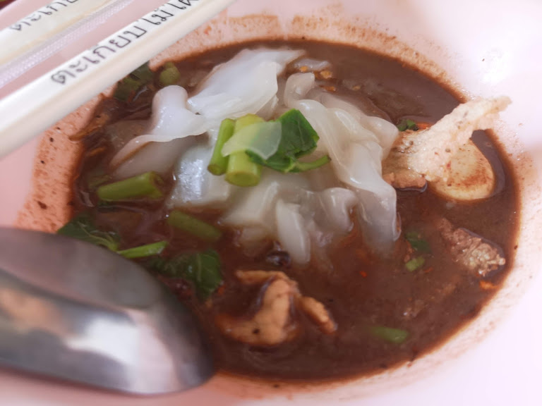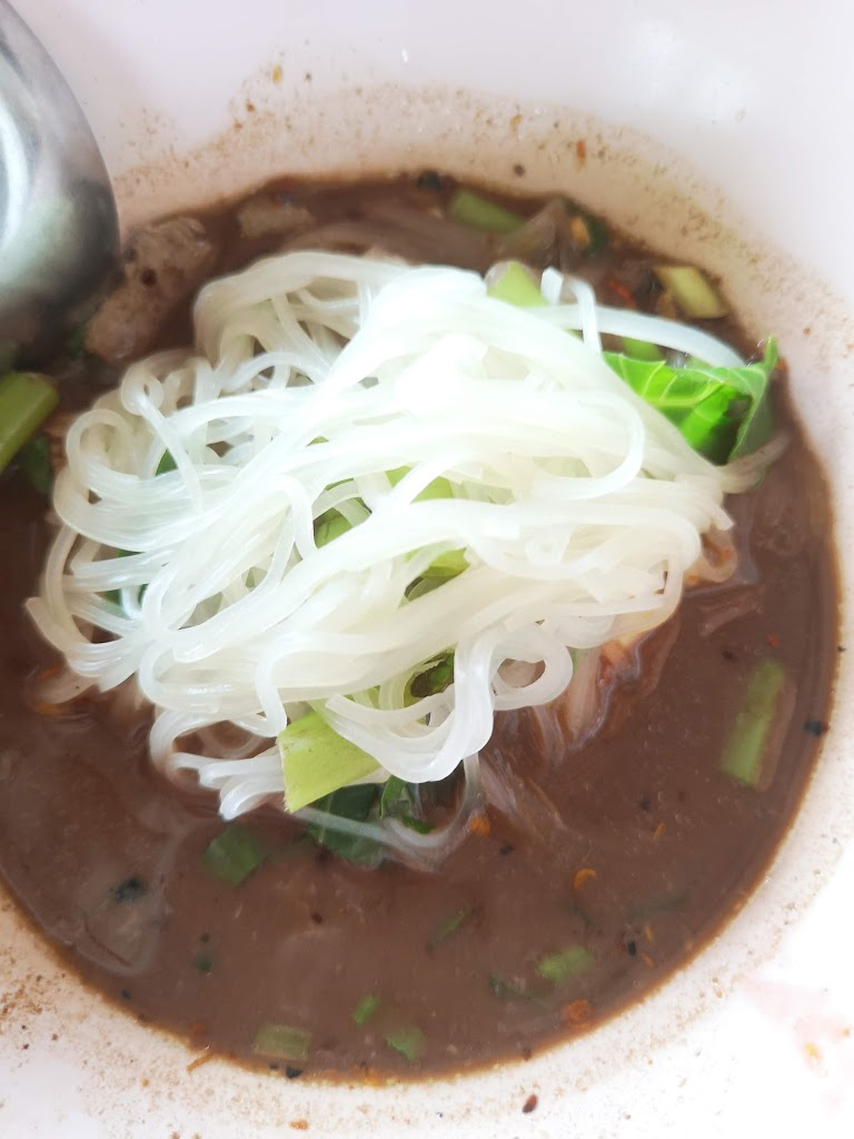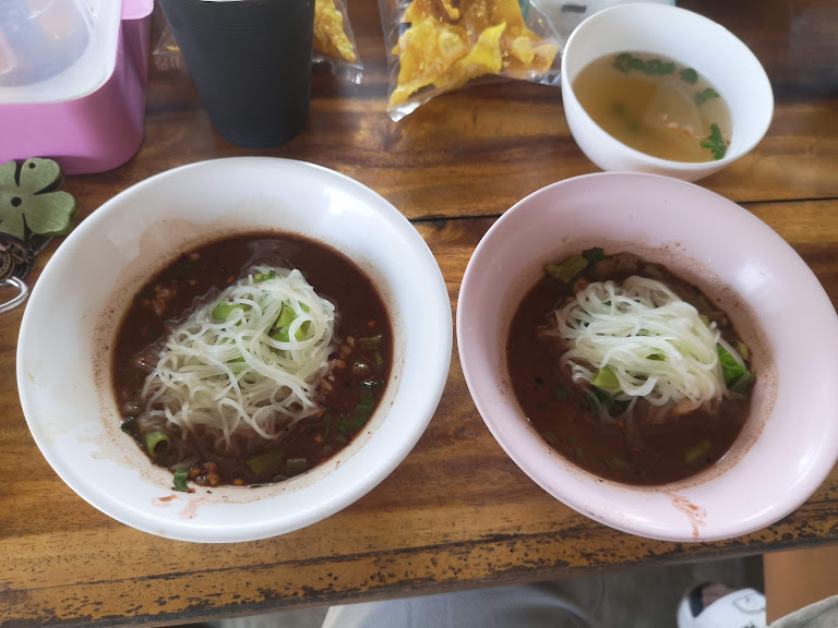 And it's the same again as well. The food list I ordered is still the same. Today it's 2 bowls of Namtok lek noodles. My wife's is also Lek Namtok, but she ordered noodles. One bowl of dry noodles. And my daughter also added another bowl of dry noodles. It became 2 bowls. Total of 2 bowls is not a misuse of words. We also have another bowl that is like my daughter's regular menu, which is the boat noodles. But today, the thing that has changed is the waterfall noodles. Normally they have clear water noodles. As for the drinks, It's still the same, that is, 3 glasses of Oliang as usual. Today the cost is 180 baht, which seems to be less than usual. And today the shop doesn't seem to have any pork rinds, so today we ordered fish dumplings instead.