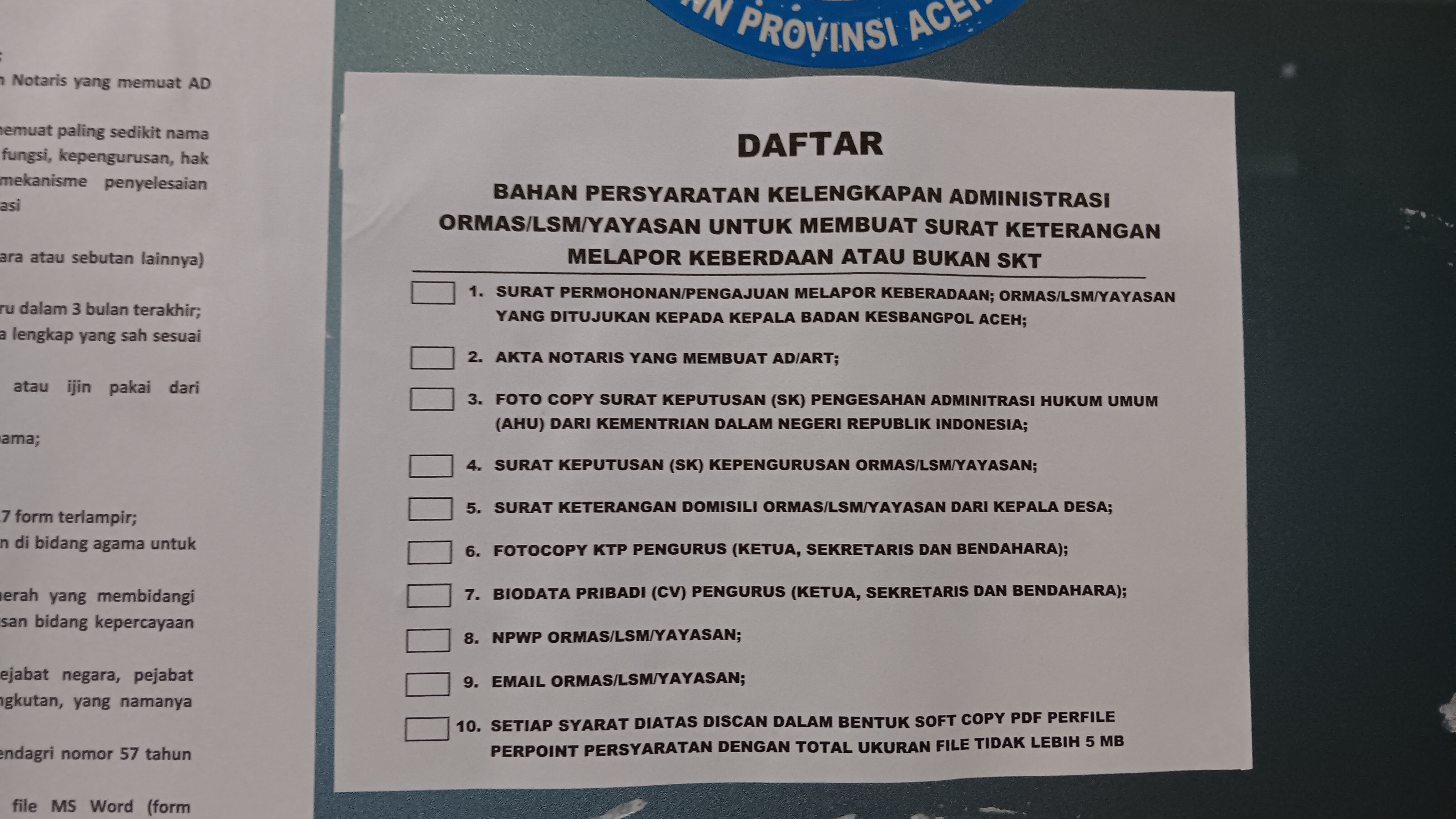 Saat saya tiba di bagian Ormas, ternyata ruangan kosong. Tidak ada pegawai di sini. Nyaris tidak ada yang bisa menjawab, kenapa ruang bisa kosong melompong. Padahal masih jam kerja. Saya pun memilih melihat segala persyaratan yang mereka tempel di pintu masuk.