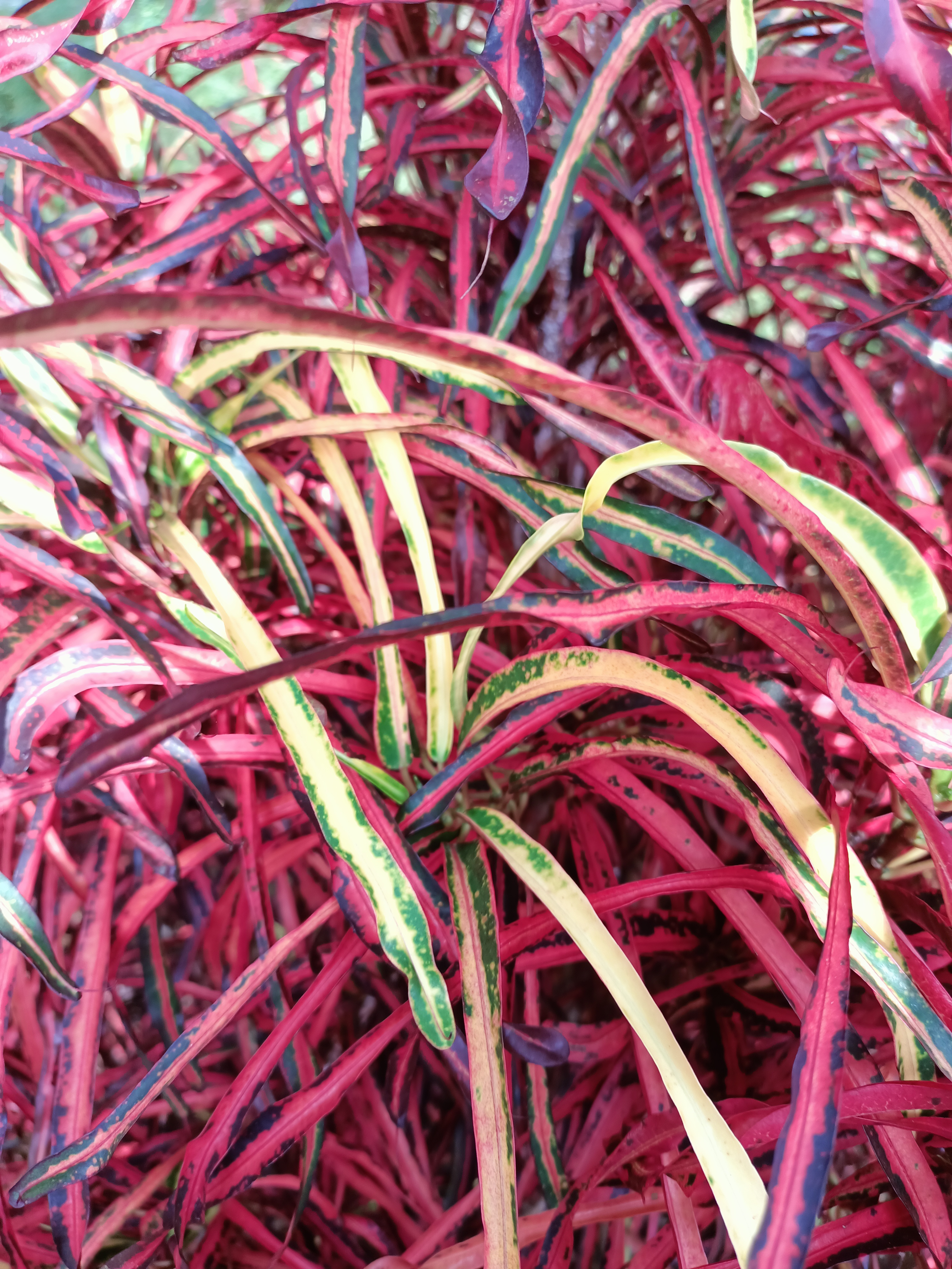 This plant is called Codiaeum variegatum, also commonly known as croton or variegated croton. This specific type, characterized by its long, narrow, multi-colored leaves that twist or arch, is the 'Zanzibar' cultivar, or the 'Firecracker' variety. The elongated, ribbon-like shape is distinctive of this cultivar.