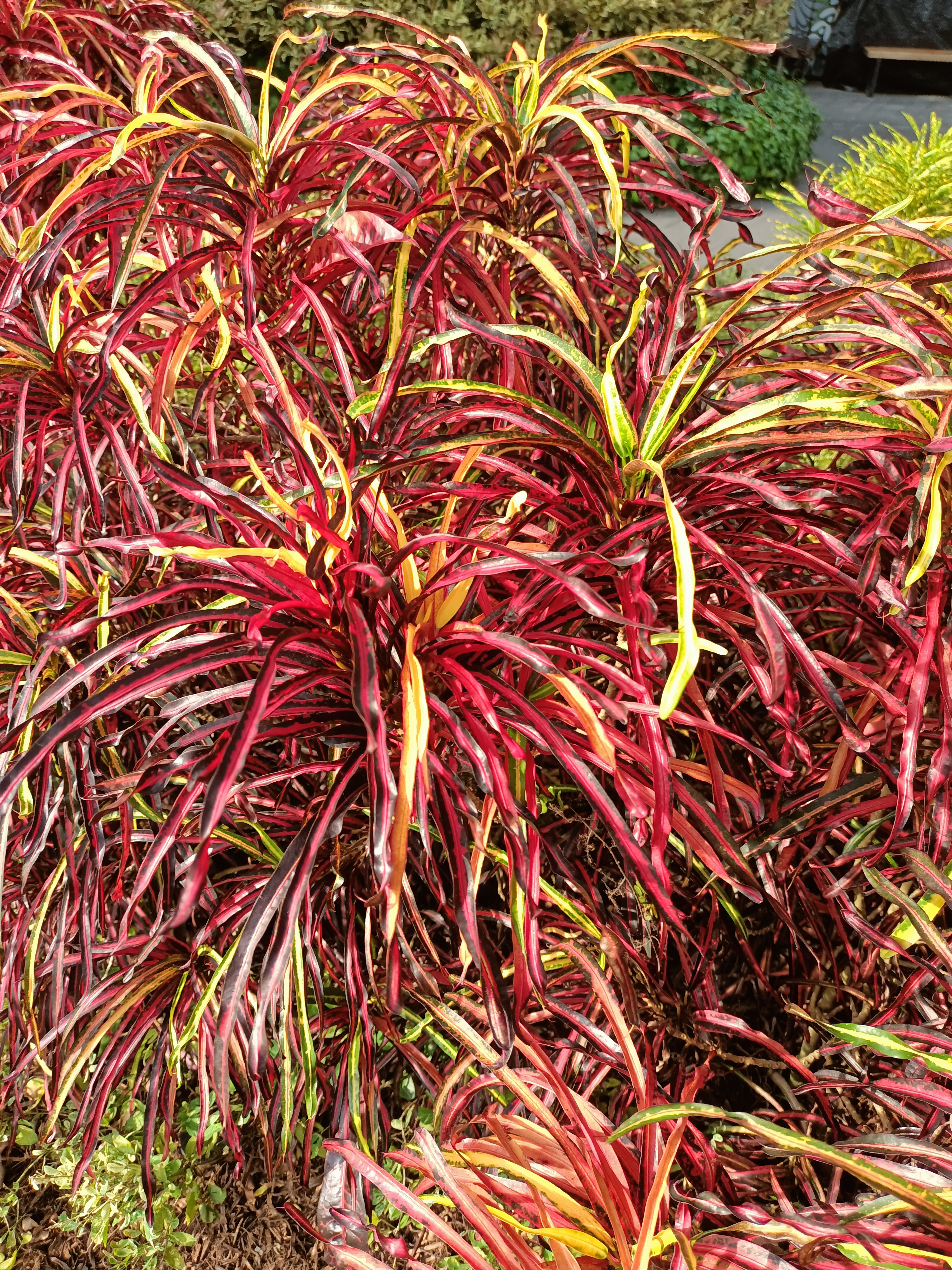 Codiaeum variegatum are native to tropical Asia where they are frequently used as landscape shrubs for dramatic hedges or focal points in gardens. The leaves are leathery, glossy, and display a vibrant mix of red, yellow, orange, and green colours.