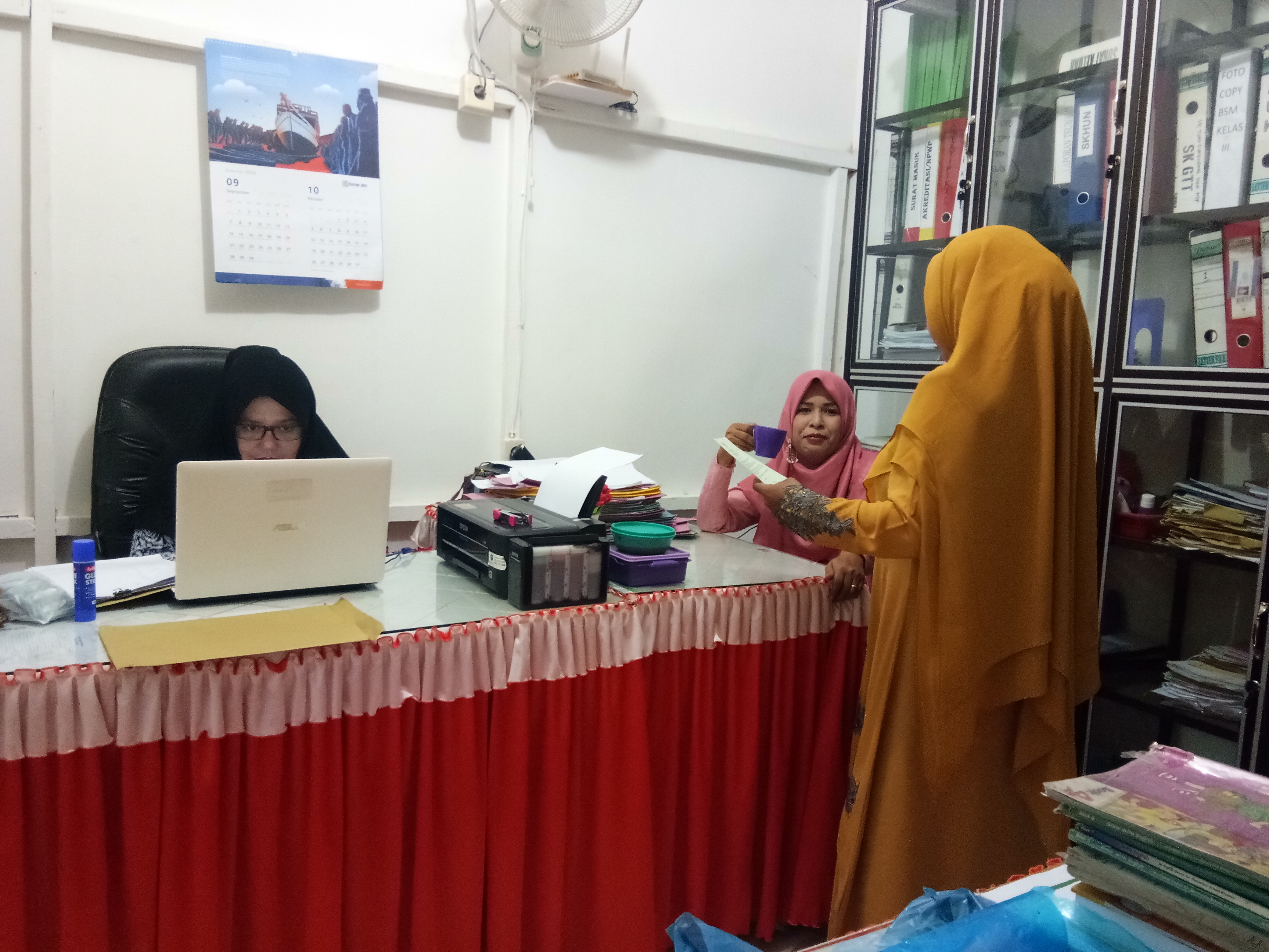 Didalam ruangan TU telah hadir tiga orang rekan dan sudah mulai dengan kesibukan mereka. Saya menyapa dan duduk di meja kerja saya dengan semangat yang dipaksakan. Saya liat muka saya di kamera depan nampak kusut dan mata bengkak. saya pikir saya harus mencoba bertahan, dan bila tidak bisa saya akan minta rekan yang piket untuk menggantikan saya di dua kelas hari ini.