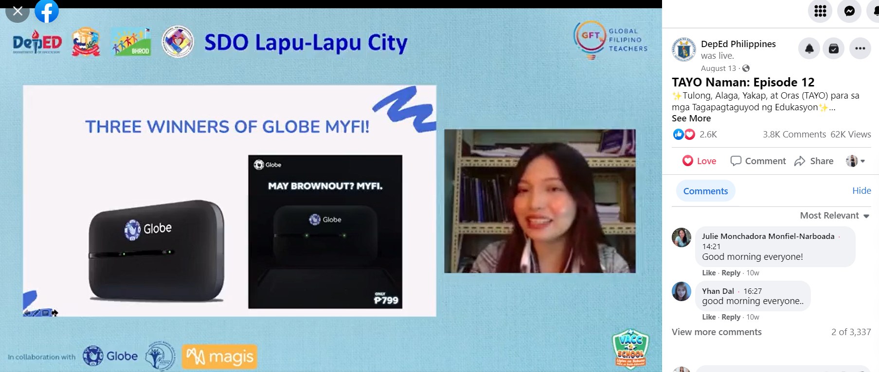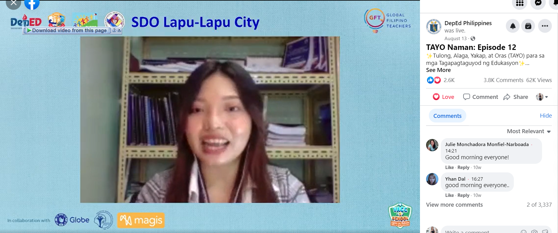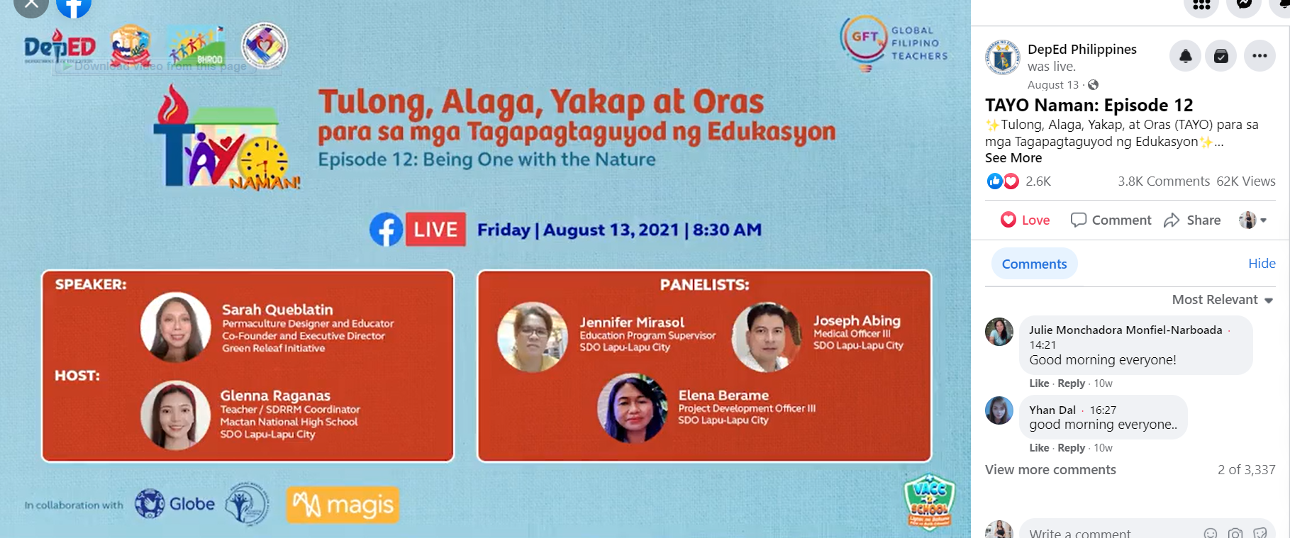 And so, we went live last August 13, 2021. The program was shown on various Facebook pages and one of those pages was the DepEd Philippines page, the official Facebook page of the Department of Education. The program went live for two hours and was viewed by 62,000 individuals all over the country! Imagine hosting and seeing your face in a national page for a national event! This never even crossed my mind but it happened and it went really well!