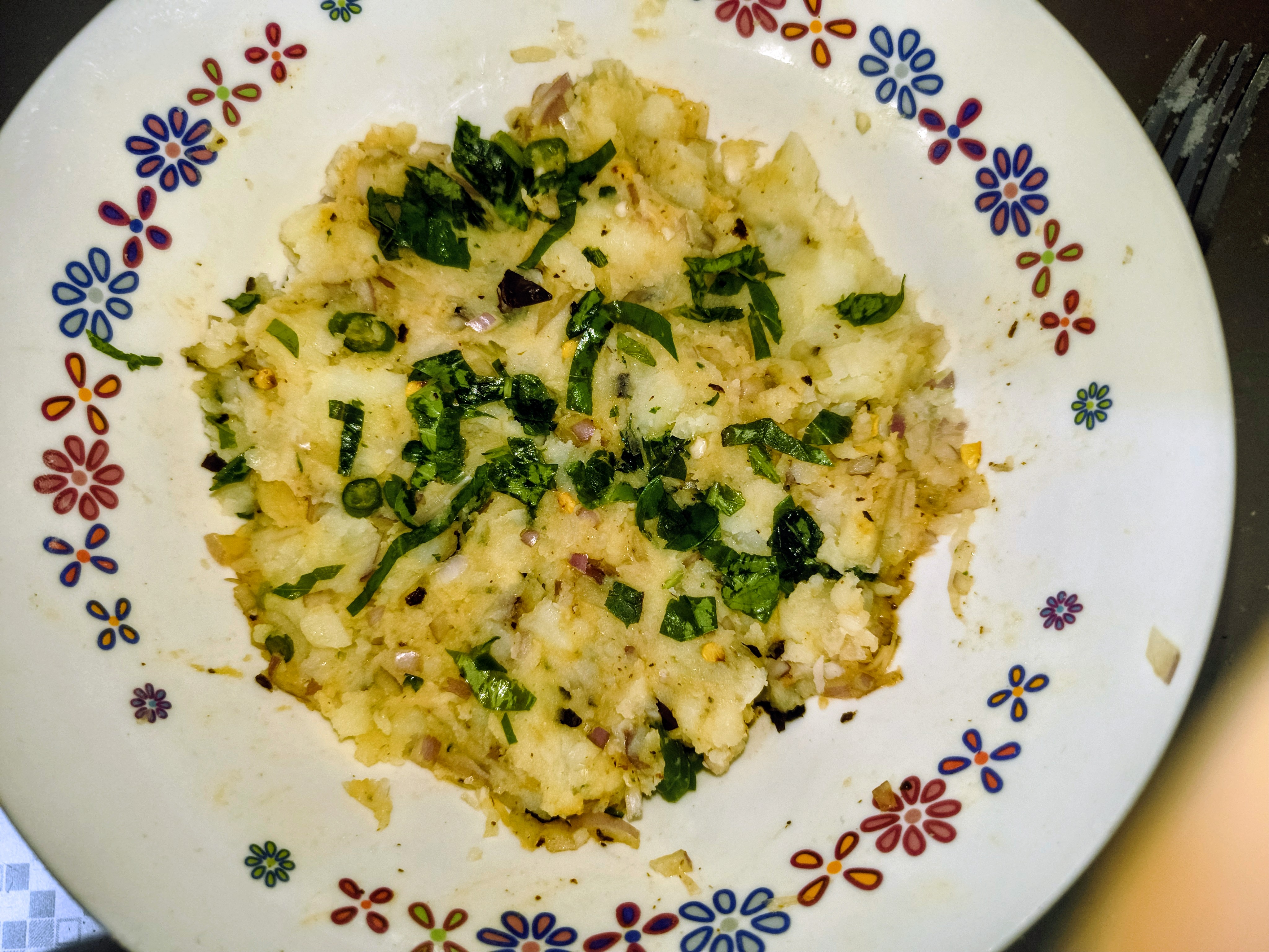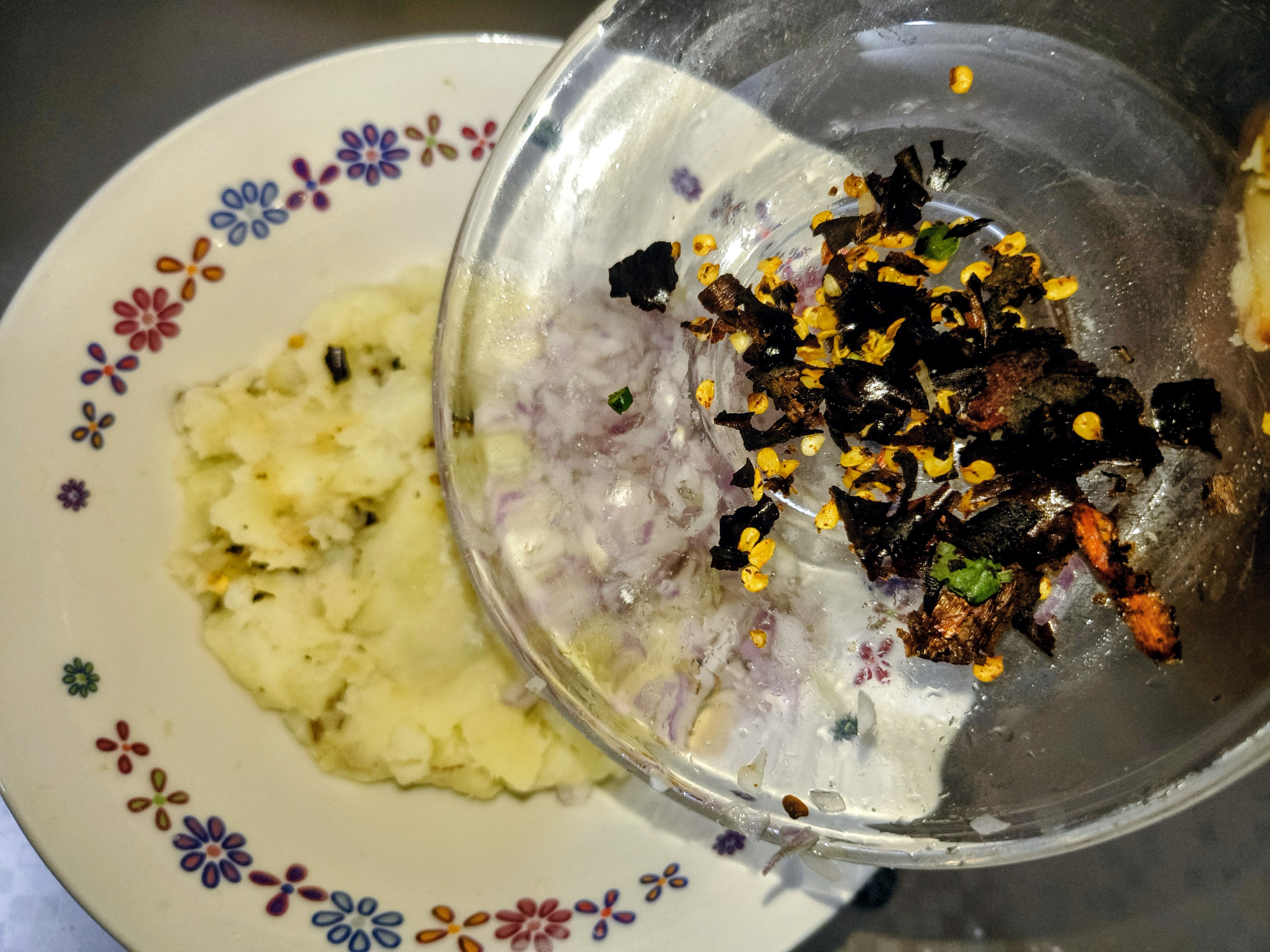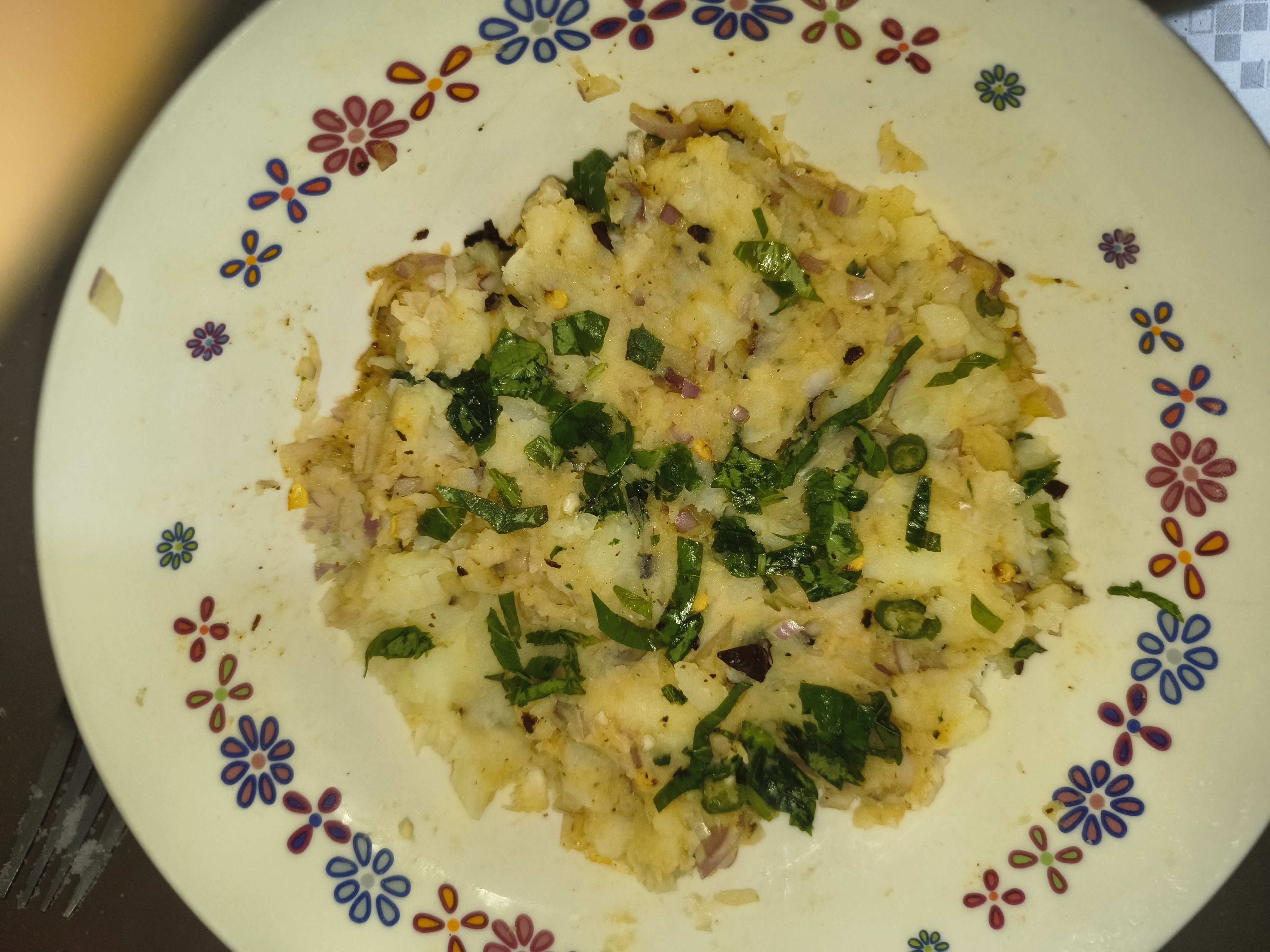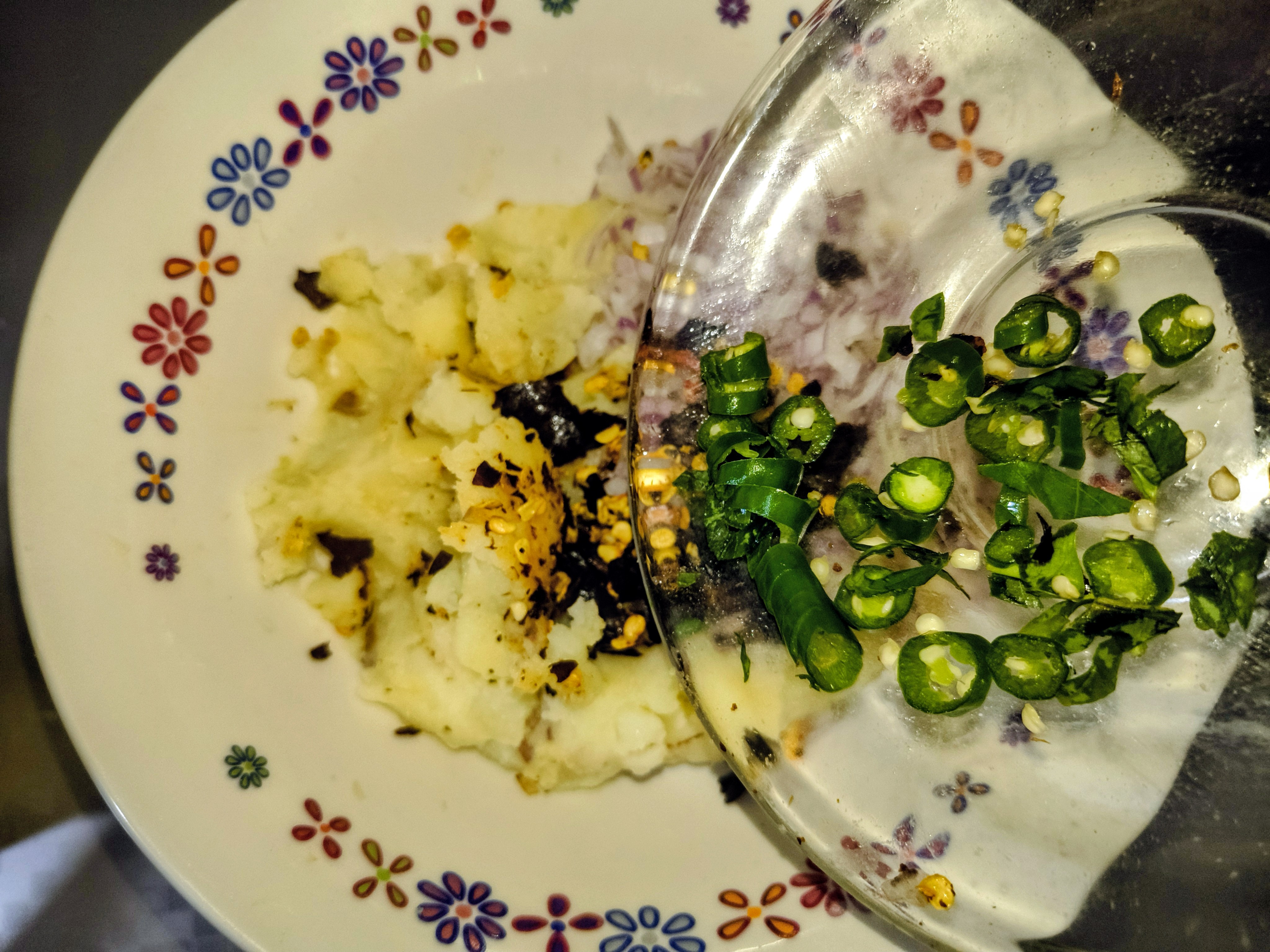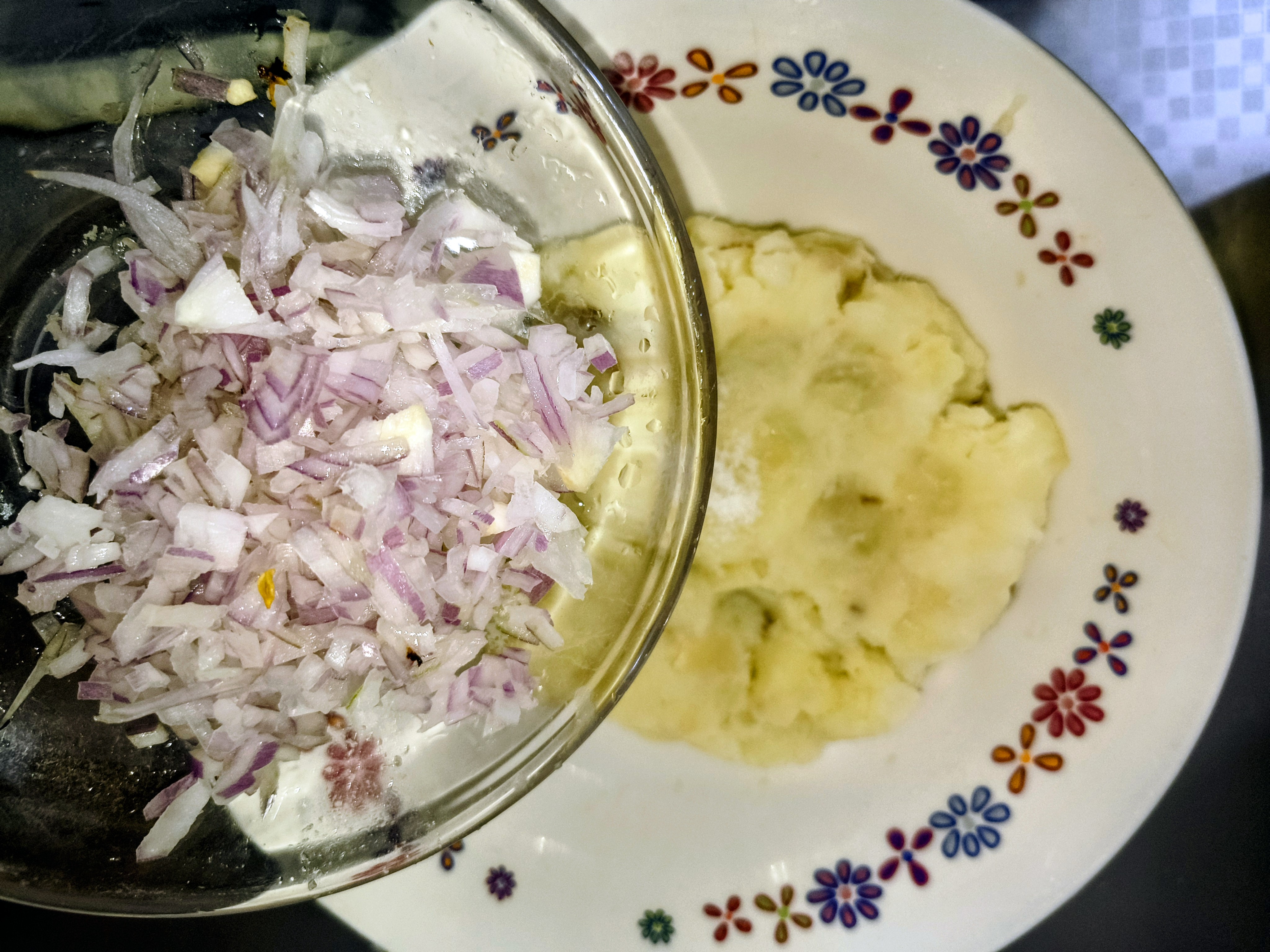 Step 2:First, add a little salt to the boiled smooth potato mixture. Then, add chopped onion, roasted chili flakes, and chopped green chilies to taste in the same bowl. Then, mix everything together well. It's a lot like potato mash.