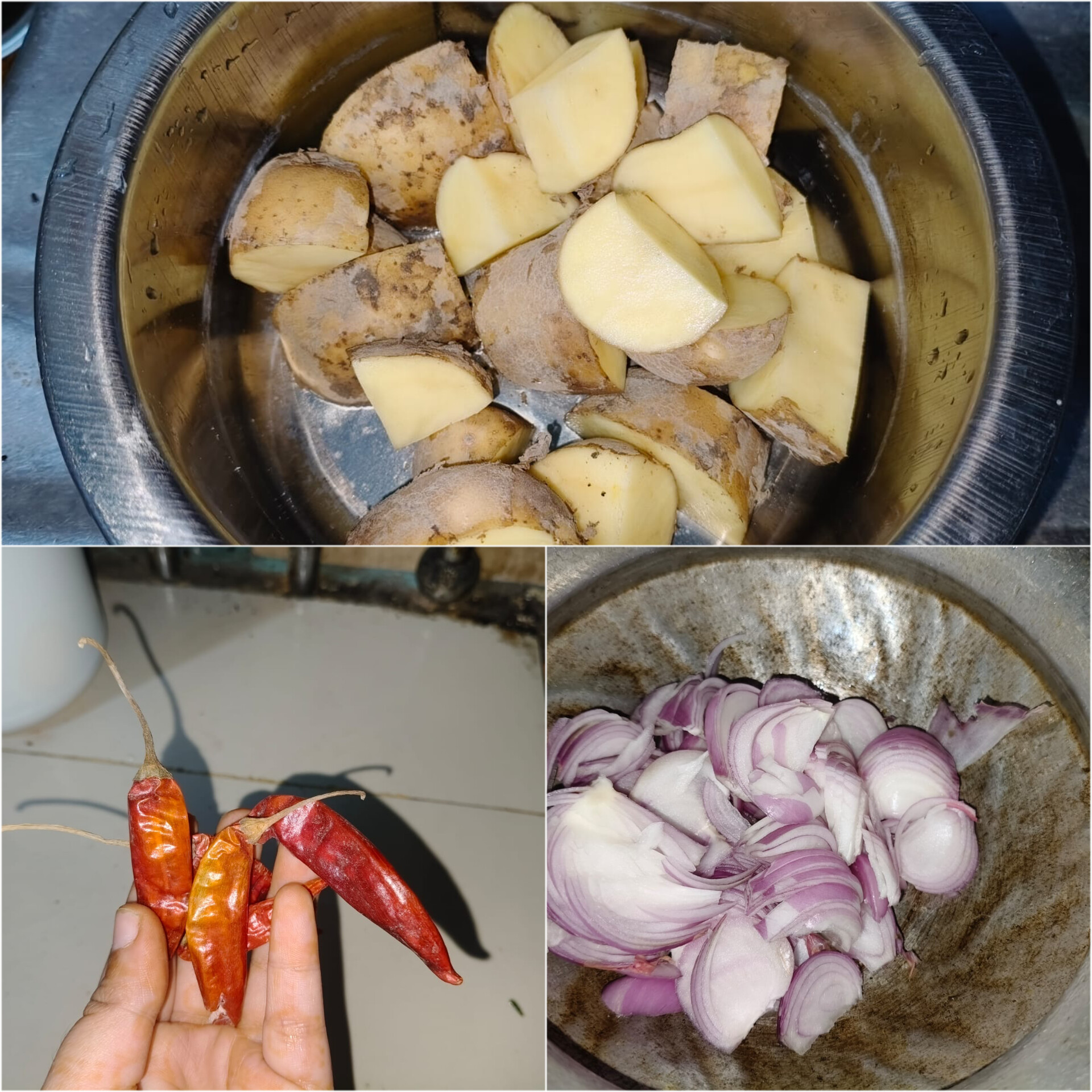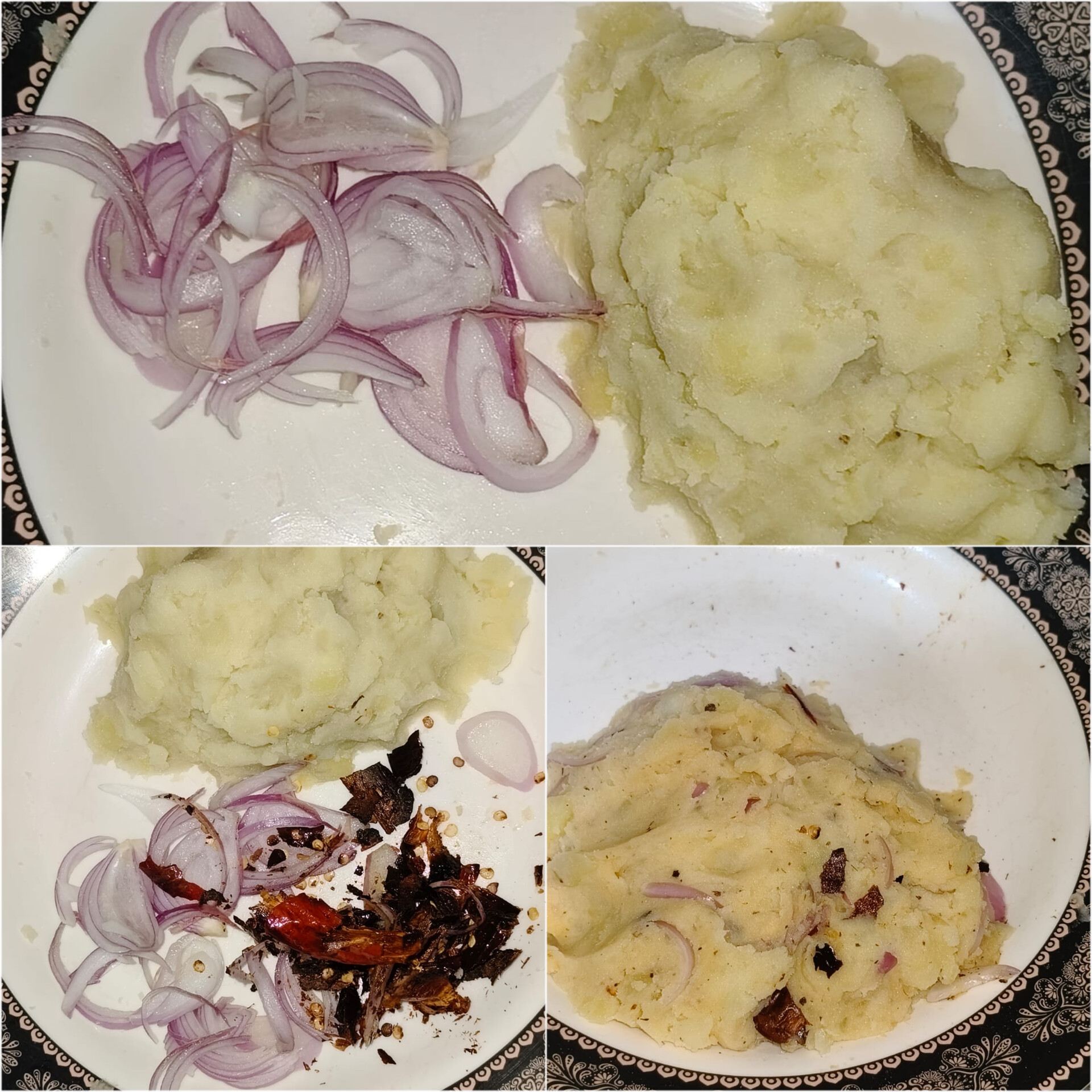 Then I chopped the onion and took the dried chilies. Then I mixed them well with my hands. I mixed everything with the potatoes to make a potato mixture and I added a little salt.