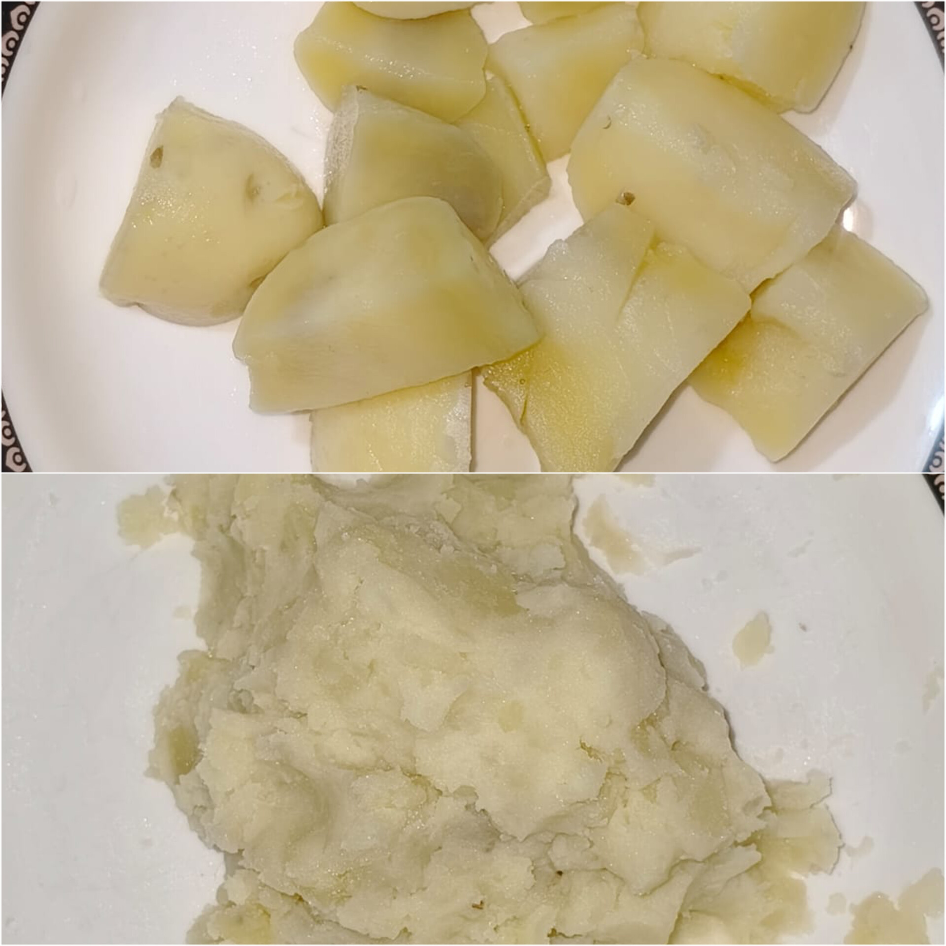 After the potatoes were cooked, I peeled the potatoes thoroughly. Then I mashed the potatoes with my hands.
