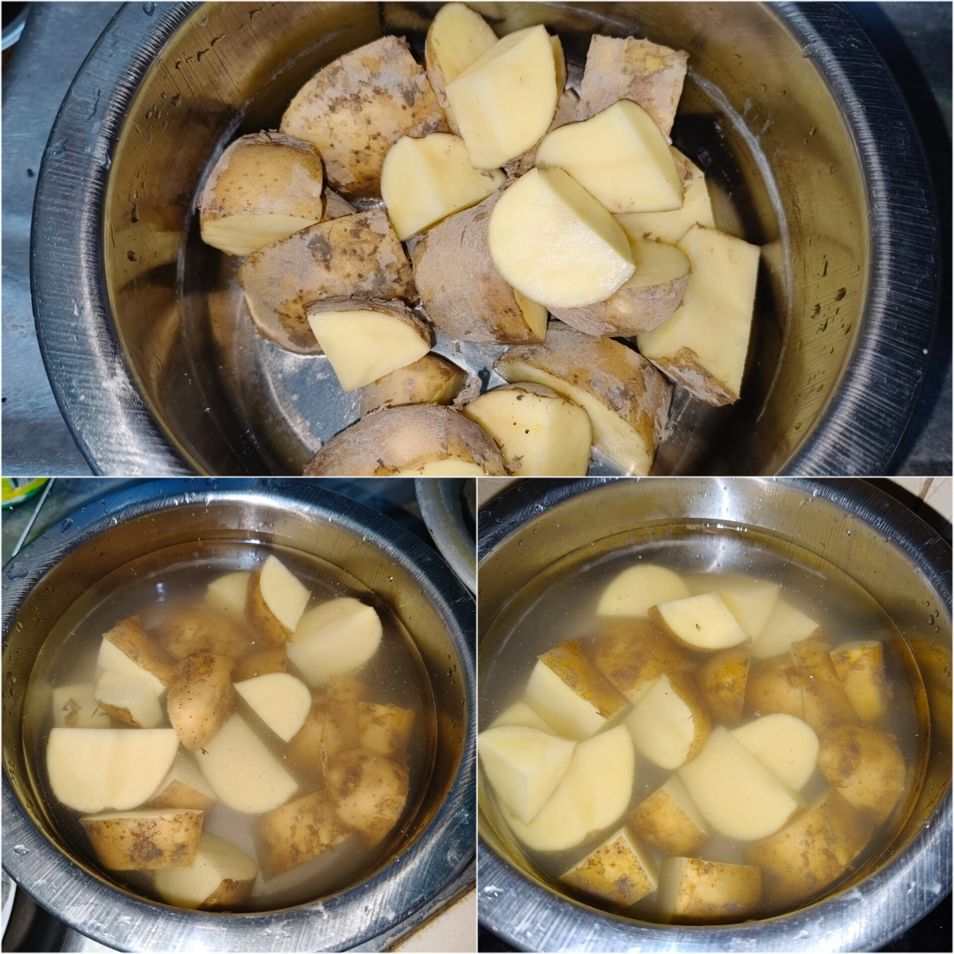 To make potato parathas, I first cut the potatoes into small pieces and put them in a pot. Then I boiled them with enough water.