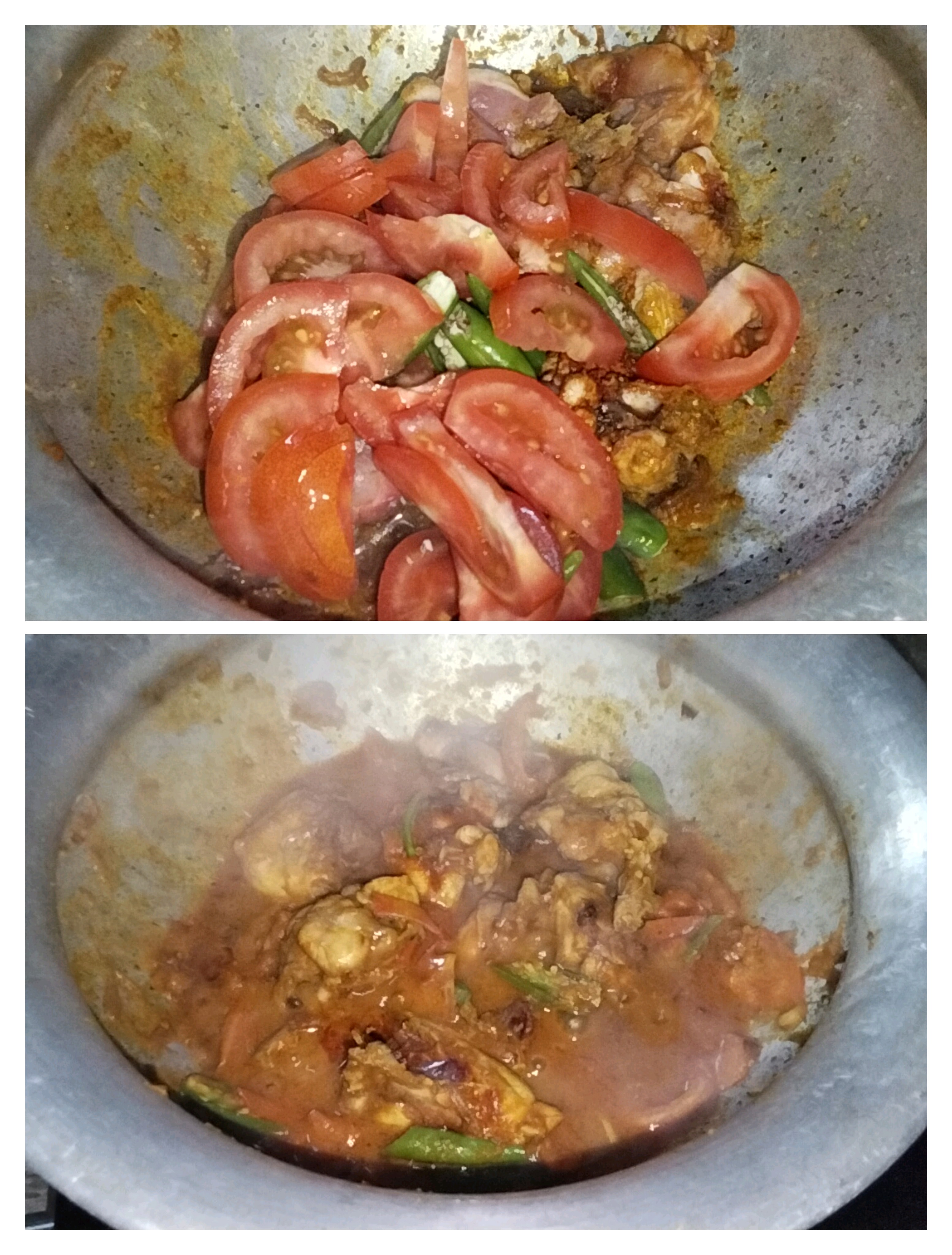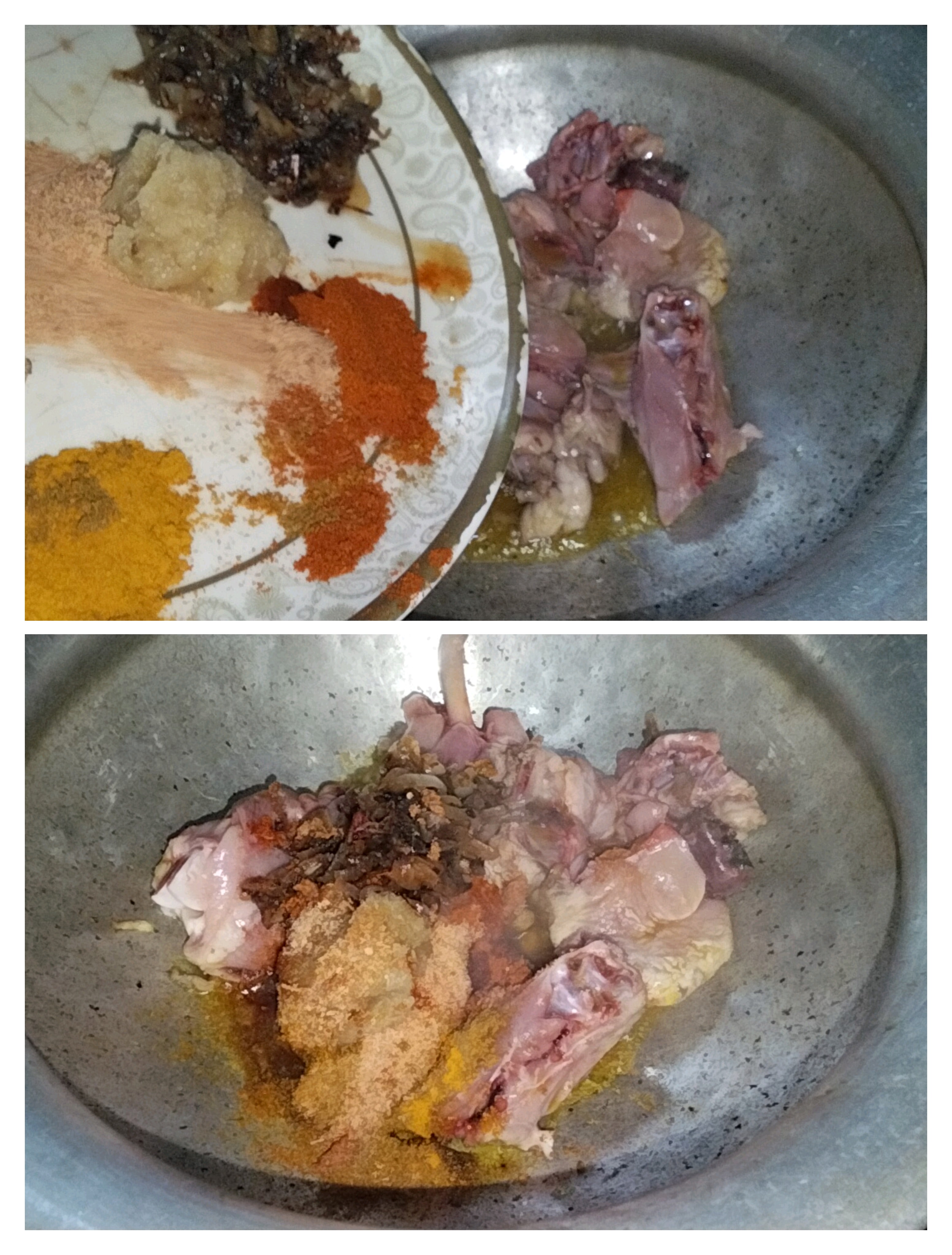 Then I put every ingredient taken from the plate, that is, the spices, in the pan. Here were turmeric powder, chili powder, garlic paste, spices.