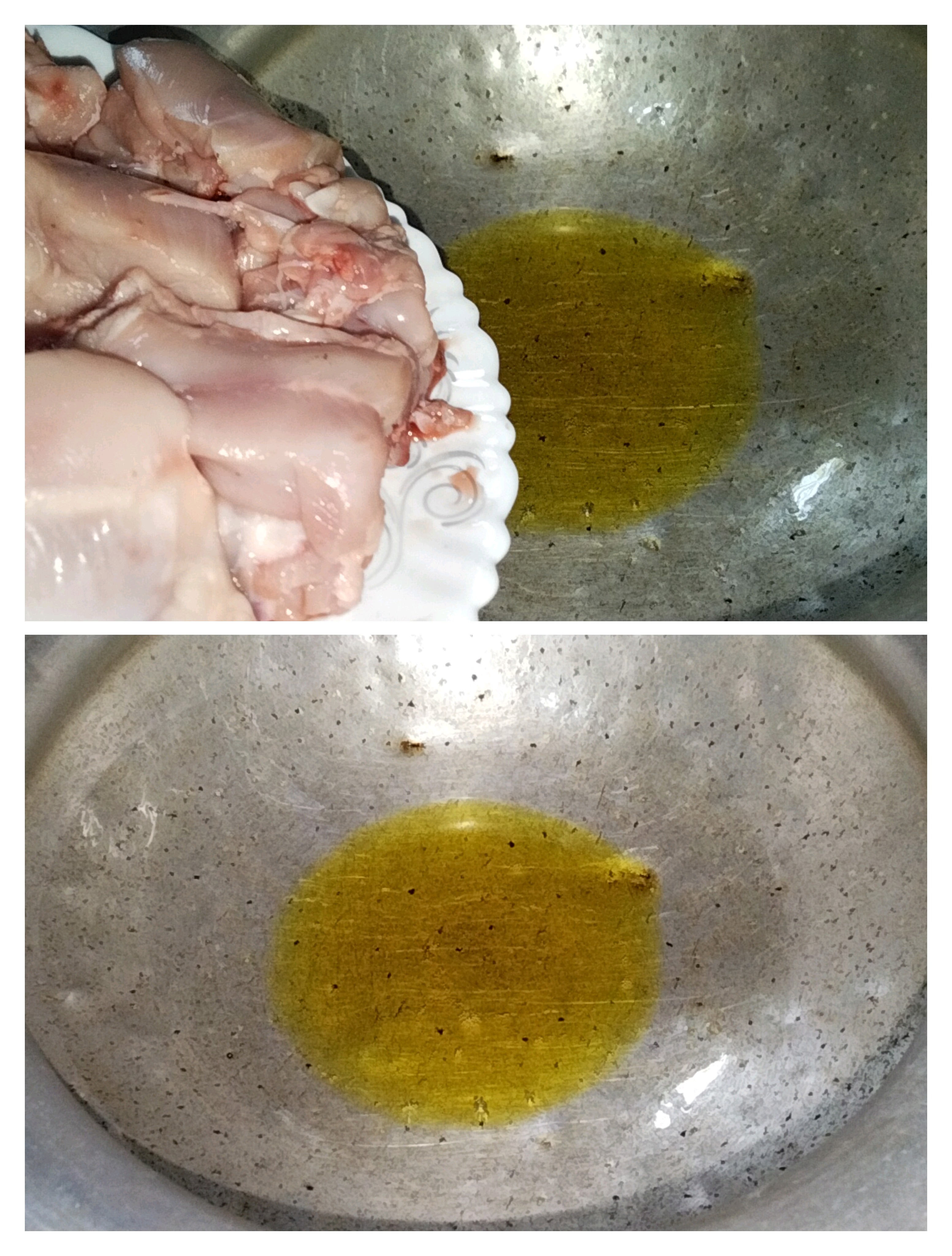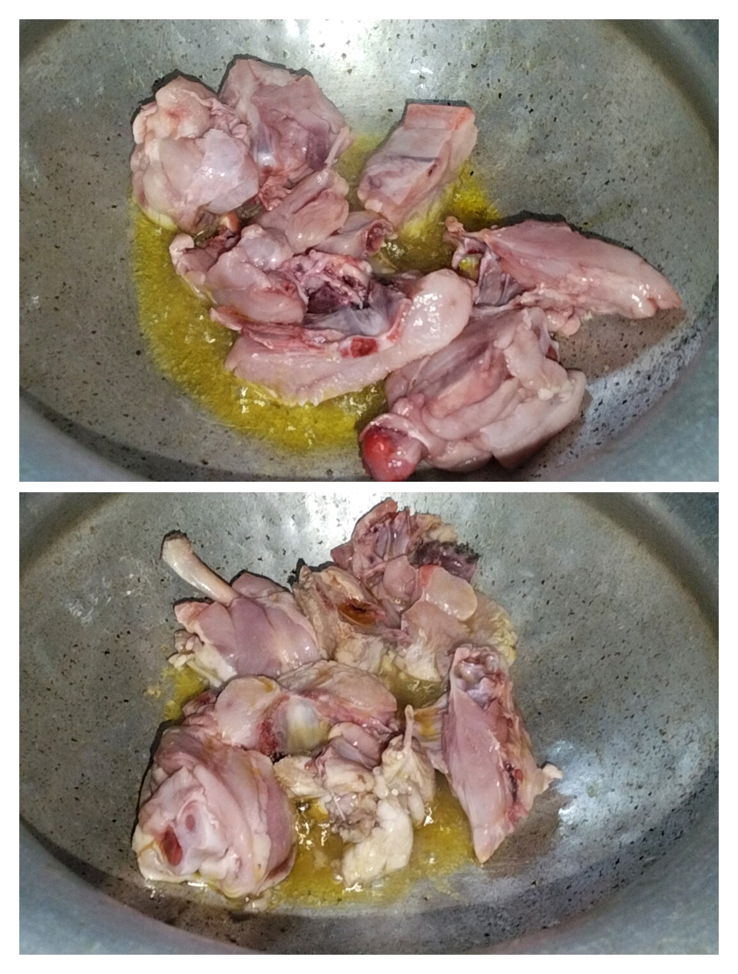 First, I put a pan with a little oil in it and put it on the stove. Then when the oil got hot, I put the well-washed chickens in the pan.