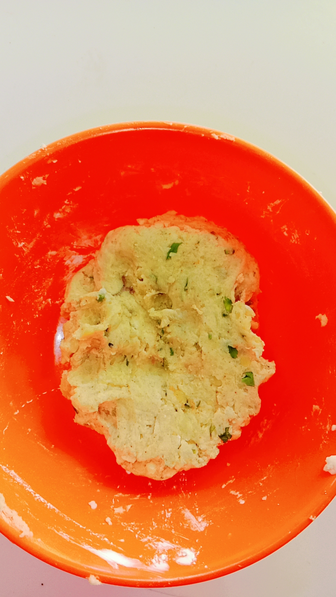 I added the soft bread into the mashed potatoes and then added corn flour salt crushed red chili green coriander and a little garam masala. I mixed everything very well until it became a smooth dough like mixture.