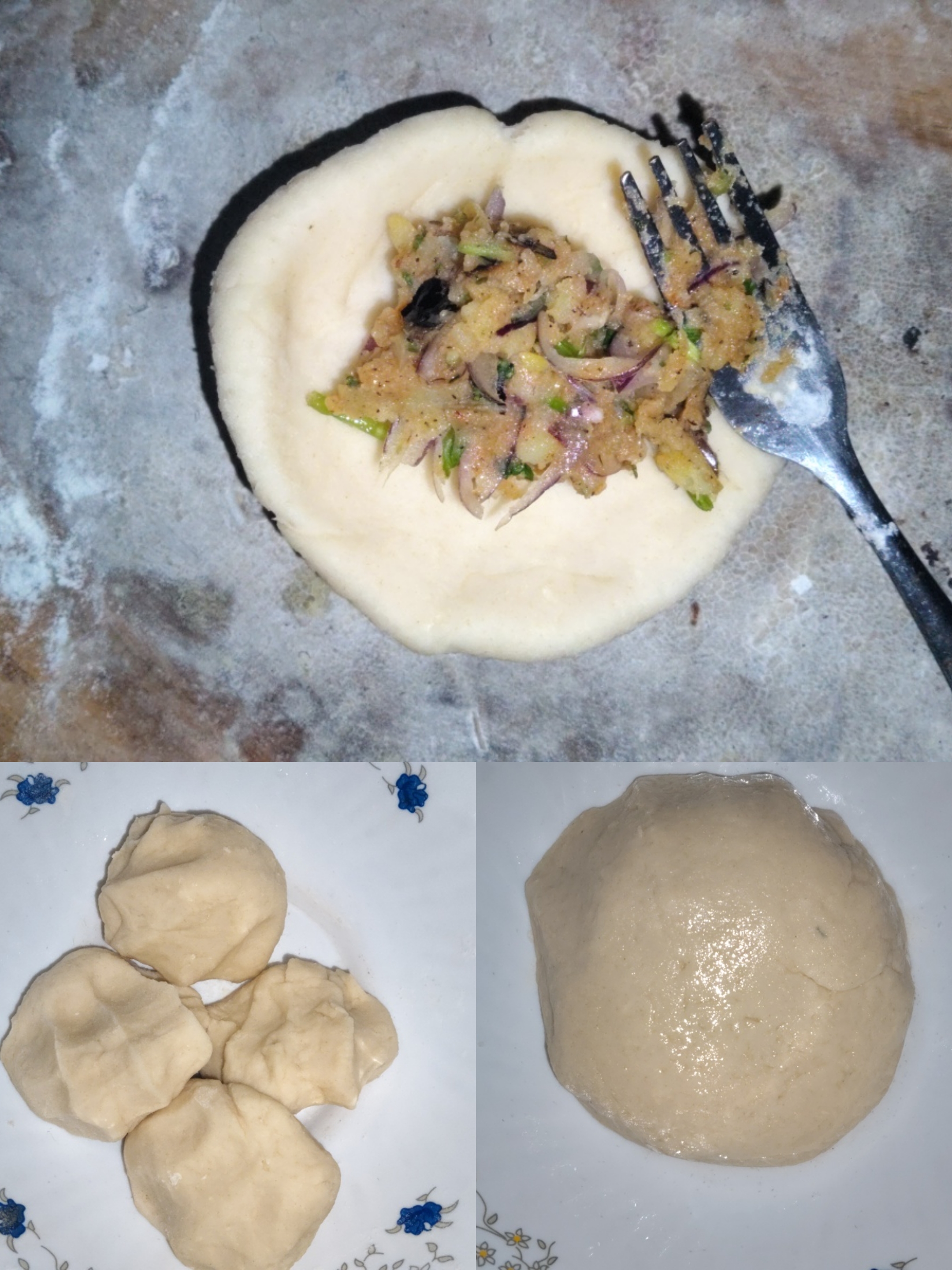 Then I mixed the flour and water well and made a soft dough. Then I made some small balls from this dough. Then I put some of the filling inside one of the balls.