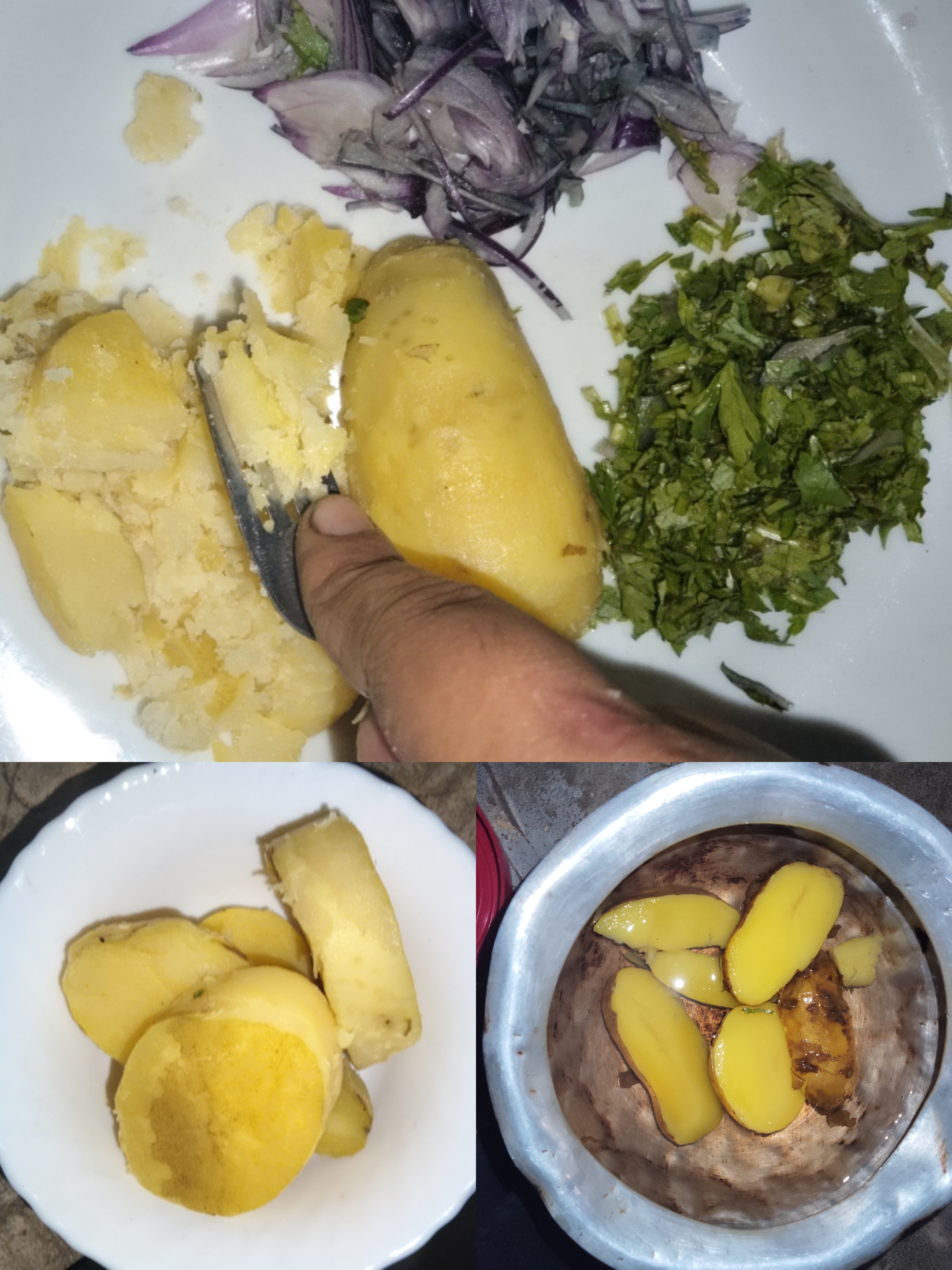 To prepare the recipe, I first cut some potatoes in half, cleaned them and boiled them. Then I peeled the boiled potatoes and put them in a bowl. Then I chopped the onion and coriander leaves.