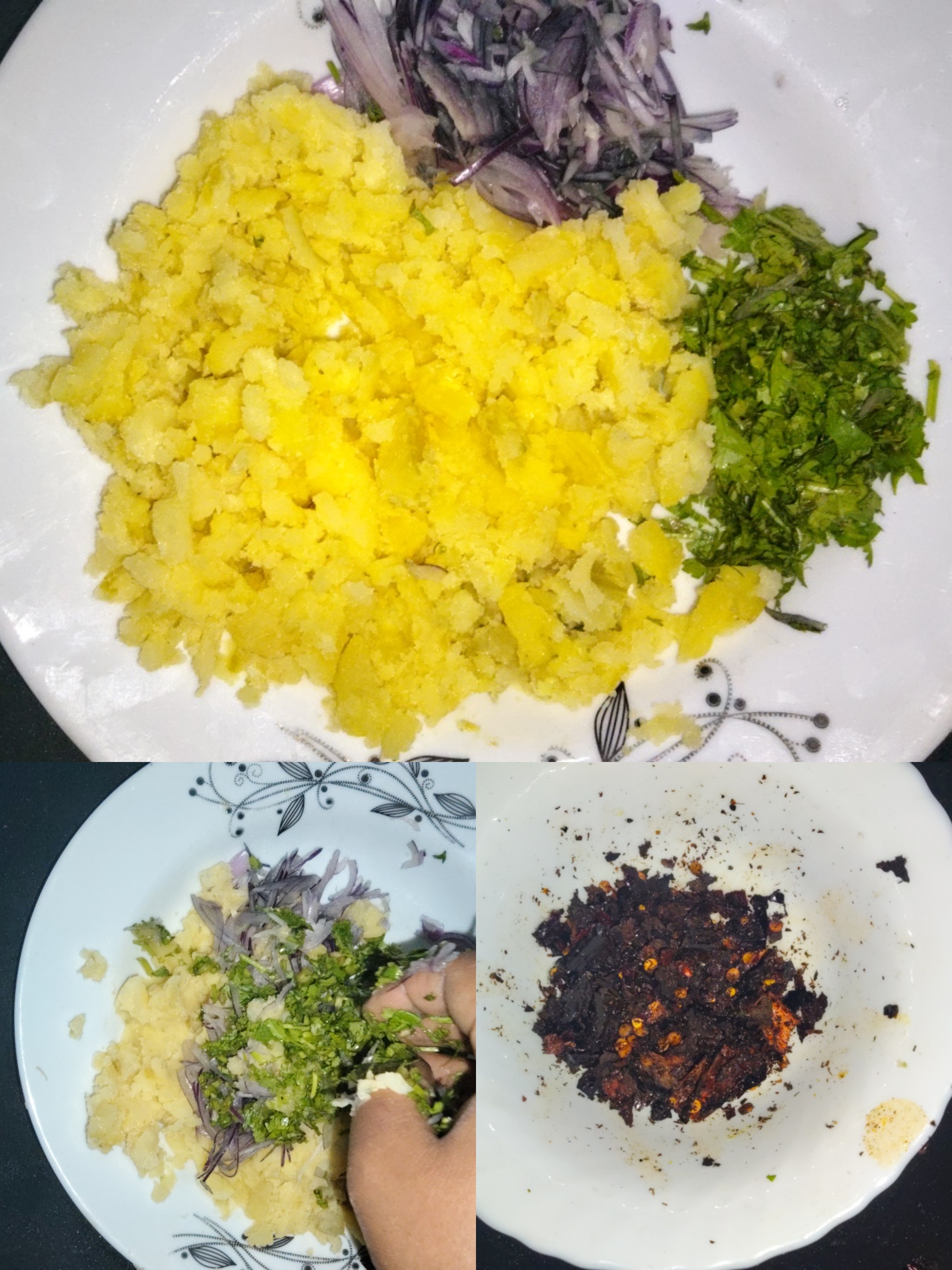 Then I mashed the potatoes with the help of the slotted spoon. Then I mixed the chopped onion and coriander leaves well with the potatoes. Then I added the roasted dry chili powder.