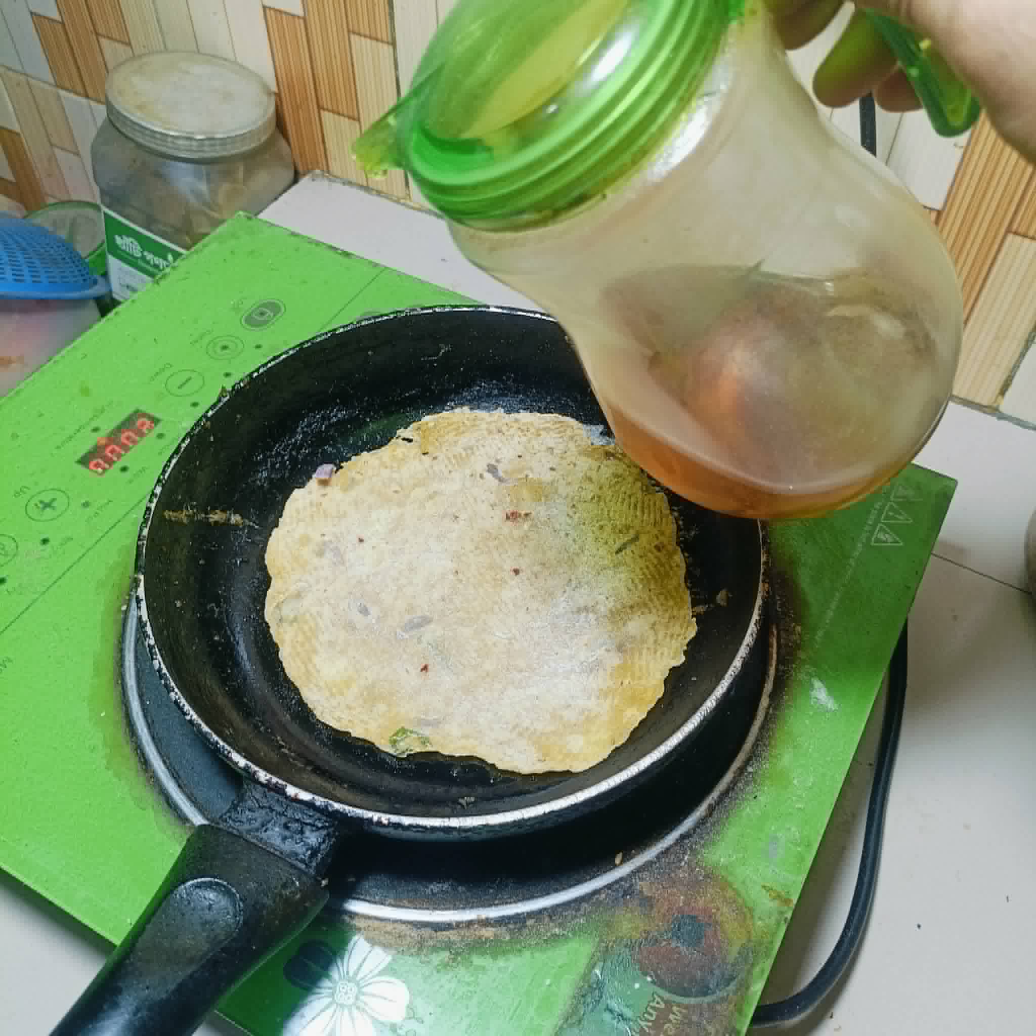 🍘Then I put a frying pan on the stove, and when it is hot, I put a loaf of bread in it and add the right amount of oil.