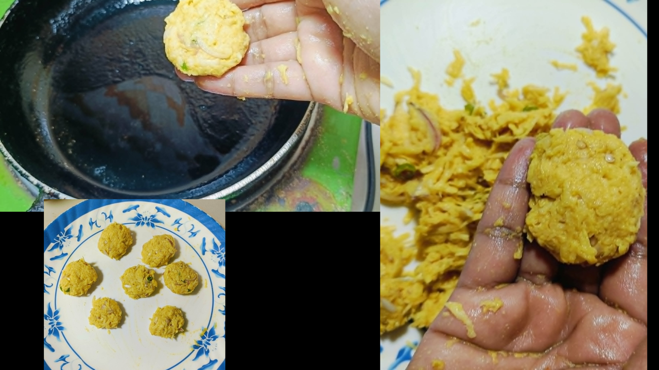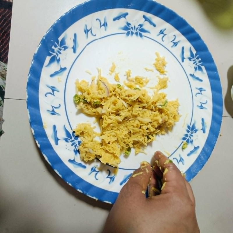 🥔Then take some potato pieces and press them with the palm of your hand to make them the size of pakoras.