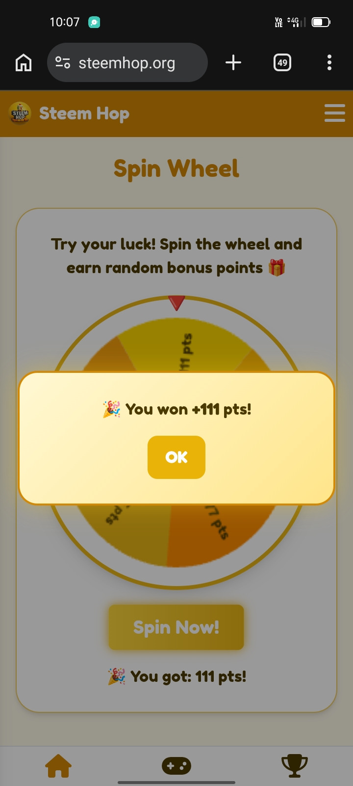 And inside this game, there is an option to click on spin. In which we have the opportunity to score a lot of points if we are lucky. And sometimes I can score quite well. But sometimes if we are unlucky, we miss. But because of this, we can increase our points a lot. But even though we could do it for a lot of points today, I enjoyed the game quite a lot. And I like to enjoy this game a lot more. I will come back to you with my experience the next day. Everyone be well.