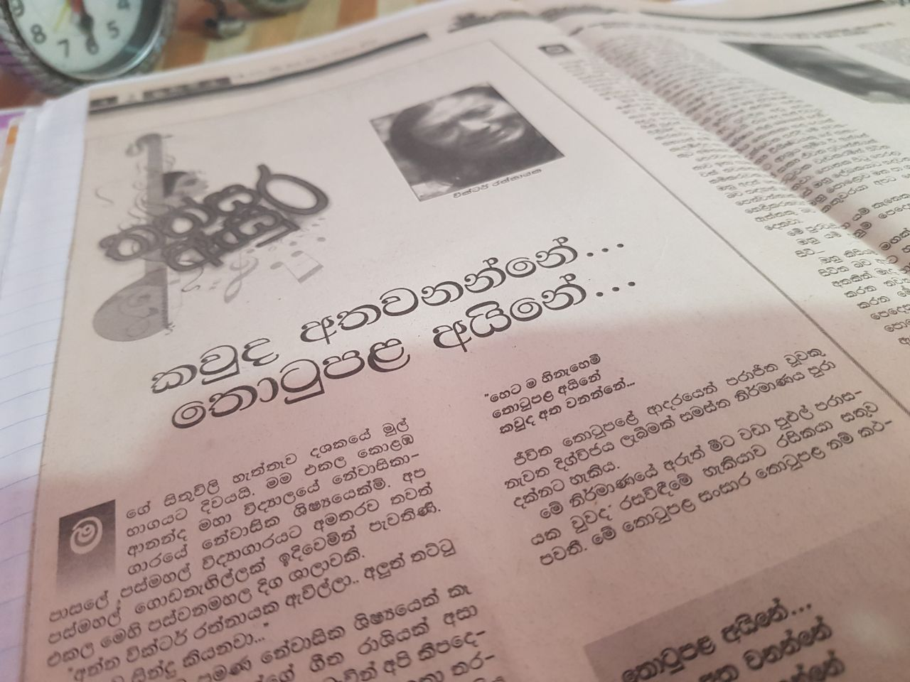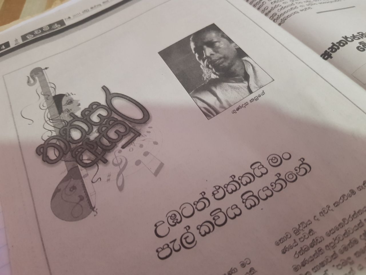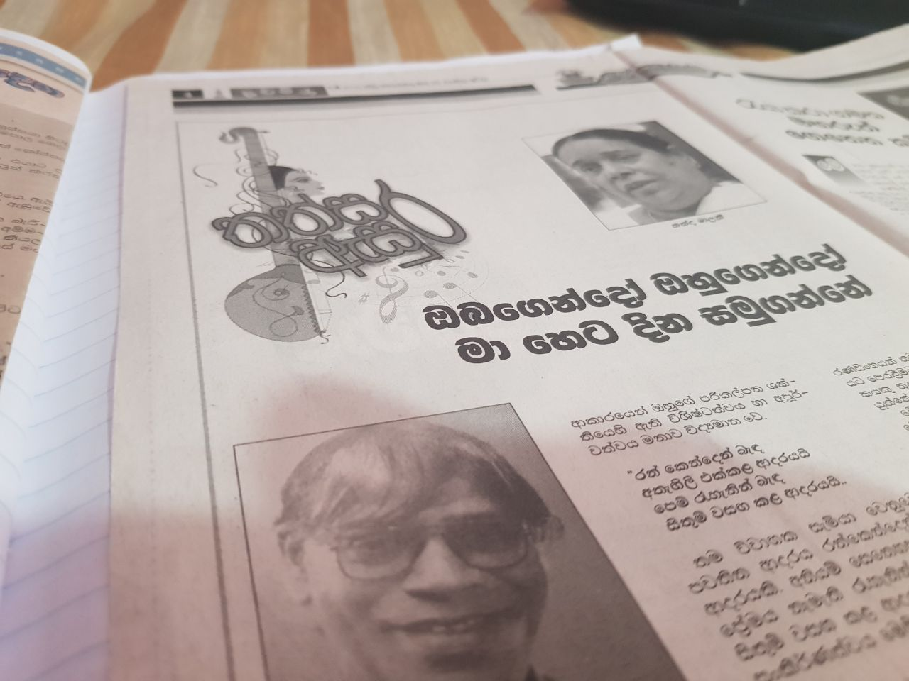 ඒකෙන් හැම සතියෙම ලස්සන තේරුමක් තියෙන සිංදුවක් ගැන කතා කරල තිබුණා. ධම්මික බණ්ඩාර මහත්මයා තමයි මේ ලිපිවල රචකයා. ඔහු හැමදාම තෝරගත්තේ පරම්පරා ගාණක් මිනිස්සු ආදරය කරපු සිංදු. පුරුද්දක් විදියට මං මේ පත්තර තීරුව එකතු කරා. පස්සෙ එකතුව වැඩි වෙද්දි ඒ ඔක්කොම පොතක් ඇලෙව්වා. ඒ විදියට අලවලා හදපු පොතක් මං ගාව තියෙනවා.