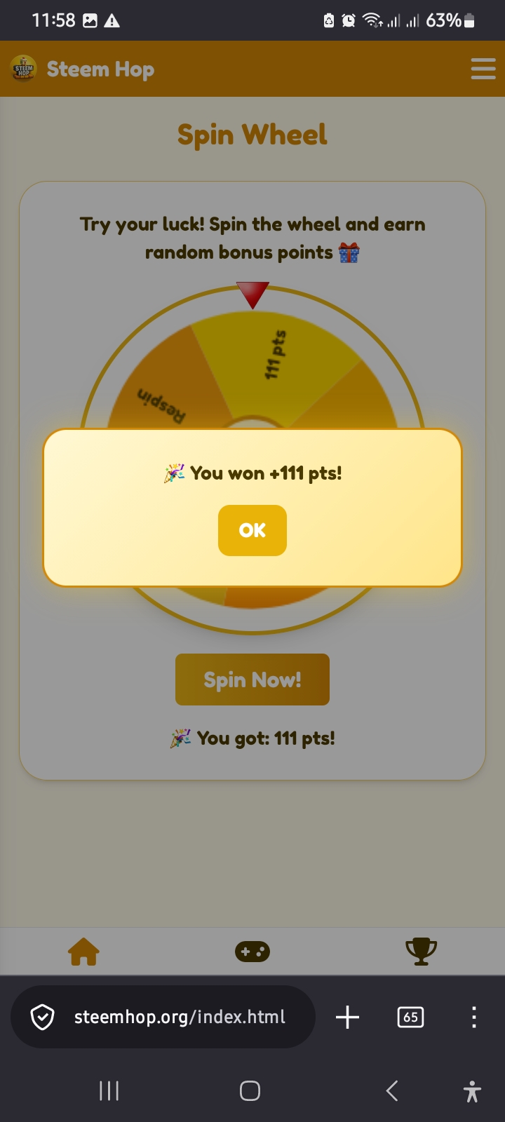 Now I clicked on the spin wheel option. After clicking, I spun the wheel and I earned +111 points.