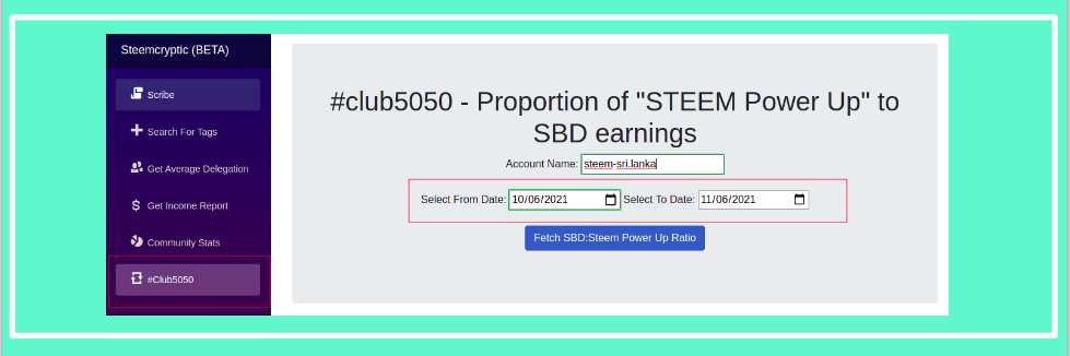 First visit the tool using this link and select the #Club5050 menu from the menu bar. Provide the username and the date range you want to check for. Then click on the fetch button.