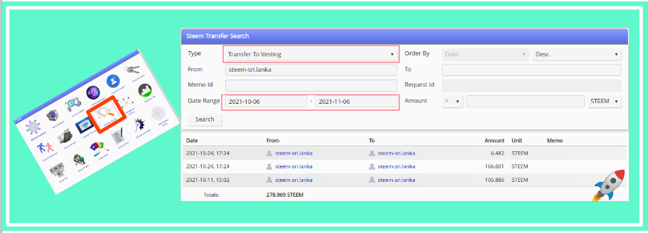 Assume that, you are going to use #club5050 tag in your today's post. Visit your steemworld page and scroll down to the Tools section. Use the Transfert Search tool and set up the following values according to your scenario. For the filter type, use Transfer to Vesting. Click search and you will receive the Powerups you made during the given date range.