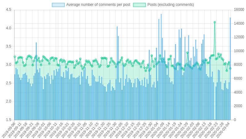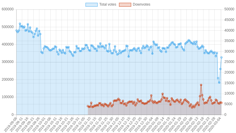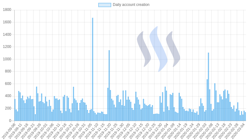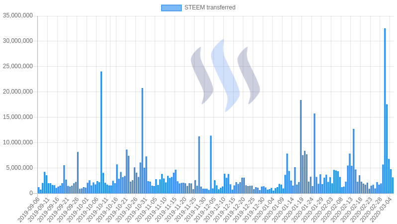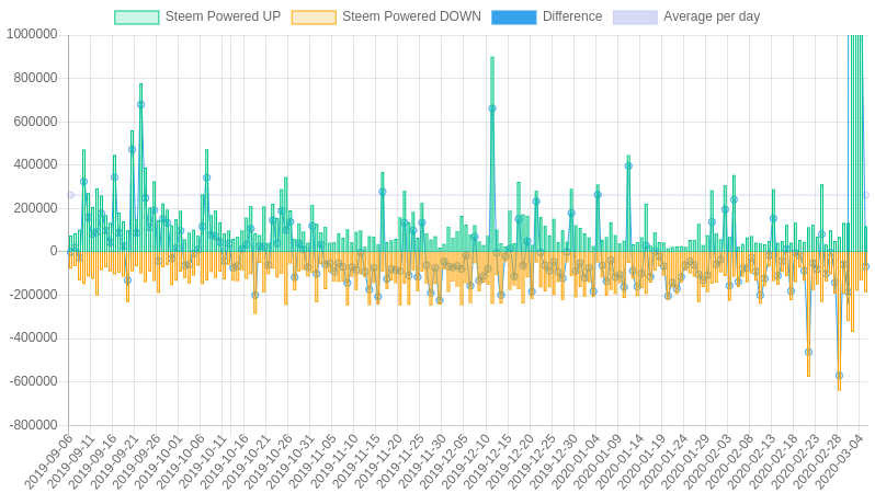 | 2020-03-01 | 133,452 STEEM | 318,108 STEEM | -184,656 STEEM |