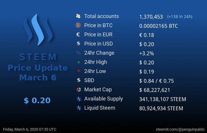Welcome to my Steem Stats Report for Friday, March 6, 2020. All data is collected directly from the Steem blockchain and is based on UTC time.