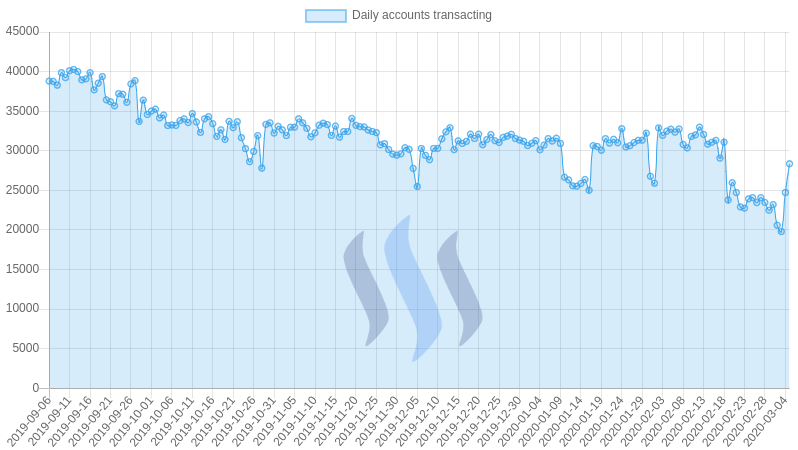 A 'transacting account' is a Steem account that made at least one transaction on the Steem blockchain. This can be a vote, post, comment, transfer, power up or sbd conversion. Users who only read from the Steem blockchain without interacting are not included. The actual number of 'Active users' is therefore much higher than the accounts transacting.