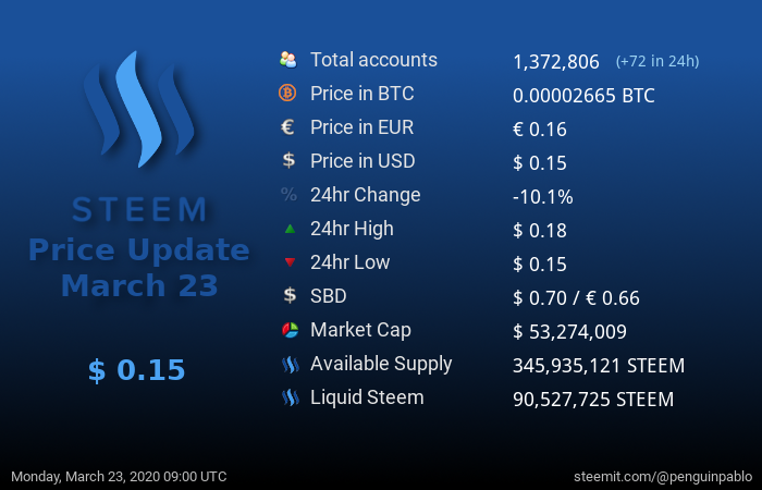 Welcome to my Steem Stats Report for Monday, March 23, 2020. All data is collected directly from the Steem blockchain and is based on UTC time.