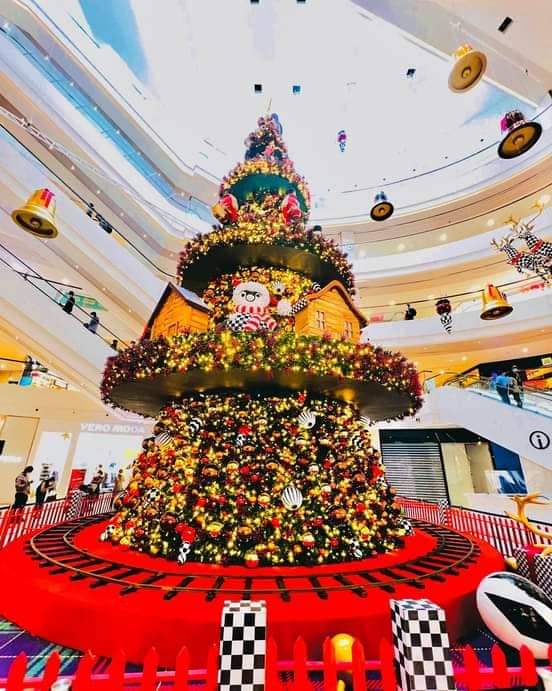 The special thing is that they create a special tree to light the Christmas lights. It is decorated in various ways. Gift boxes are also hung on this tree. This is the tree. A big star is created at the top of the tree.