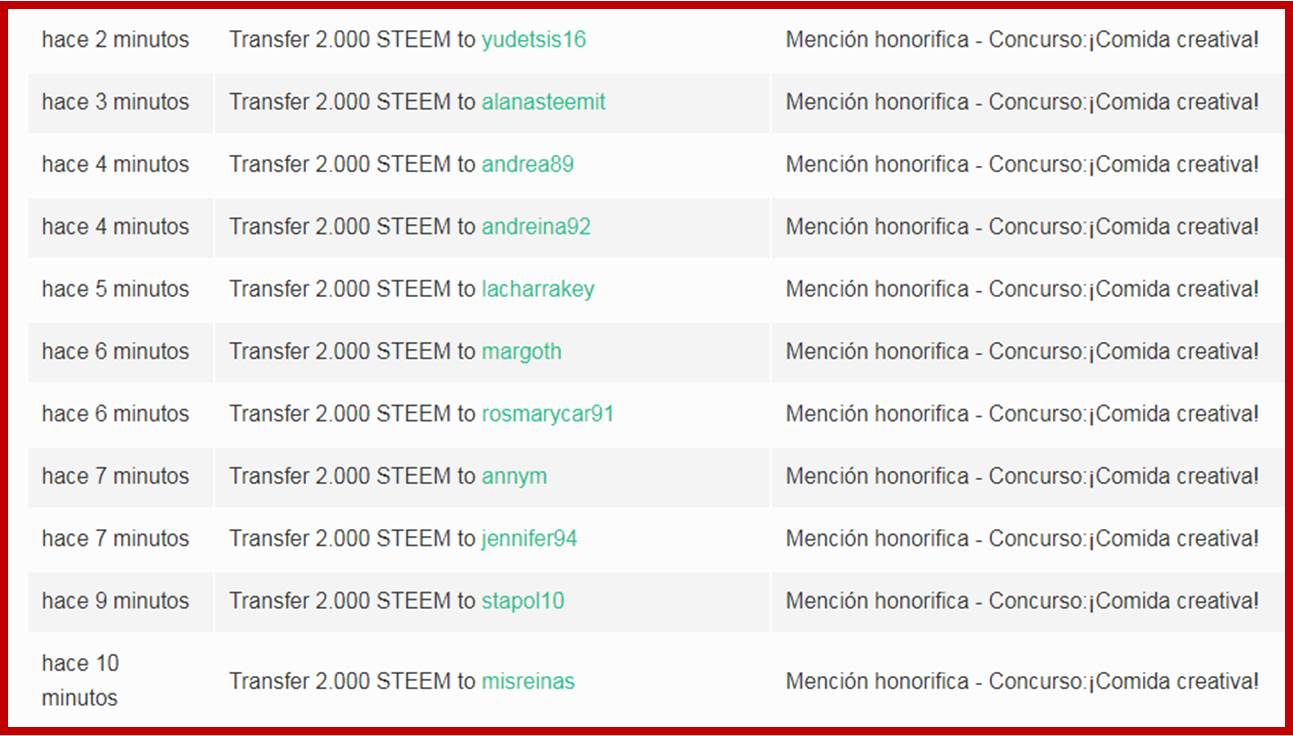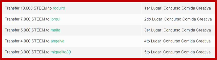 El tema de esta iniciativa fue aportado por nuestra compañera @rypo01 y en conjunto con @edlili24 y @tocho2 fueron atendidas las entradas de los participantes, La selección estuvo a cargo de @rypo01 considerando como principal criterio el cumplimiento de las reglas, con mayor énfasis en el detalle del paso a paso de su receta y la creatividad. En cuanto a los premios y en virtud de las entradas tan hermosas consideramos como equipo de trabajo dar 11 menciones honorificas de 2 Steem cada una, monto suministrado por @edlili24 y @rypo01 .