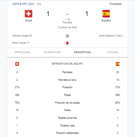 Me acosté ah ver el juego de fútbol, estaba jugando Suiza y España el cual quedo empatado 1-1 y culminaron los 90 minutos de juego, luego se fueron ah tiempos extra el cual termino y seguía estando empatado el juego 1-1 un juego bien cerrado y muy emocionante partido, ah la final se tuvieron que ir ah los penales el cual gano España 3-1 en penales así España se clasifica ah los 4 de finales de la euro copa 2021.