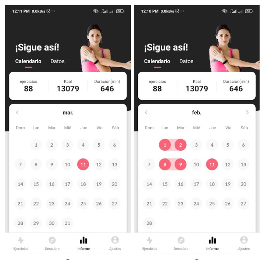 La App. El tiempo que duré sin hacer ejercicios. Haciendo mi ejercicios de nuevo. Capturé de pantalla con mi celular Xiaomi Redmi 8.