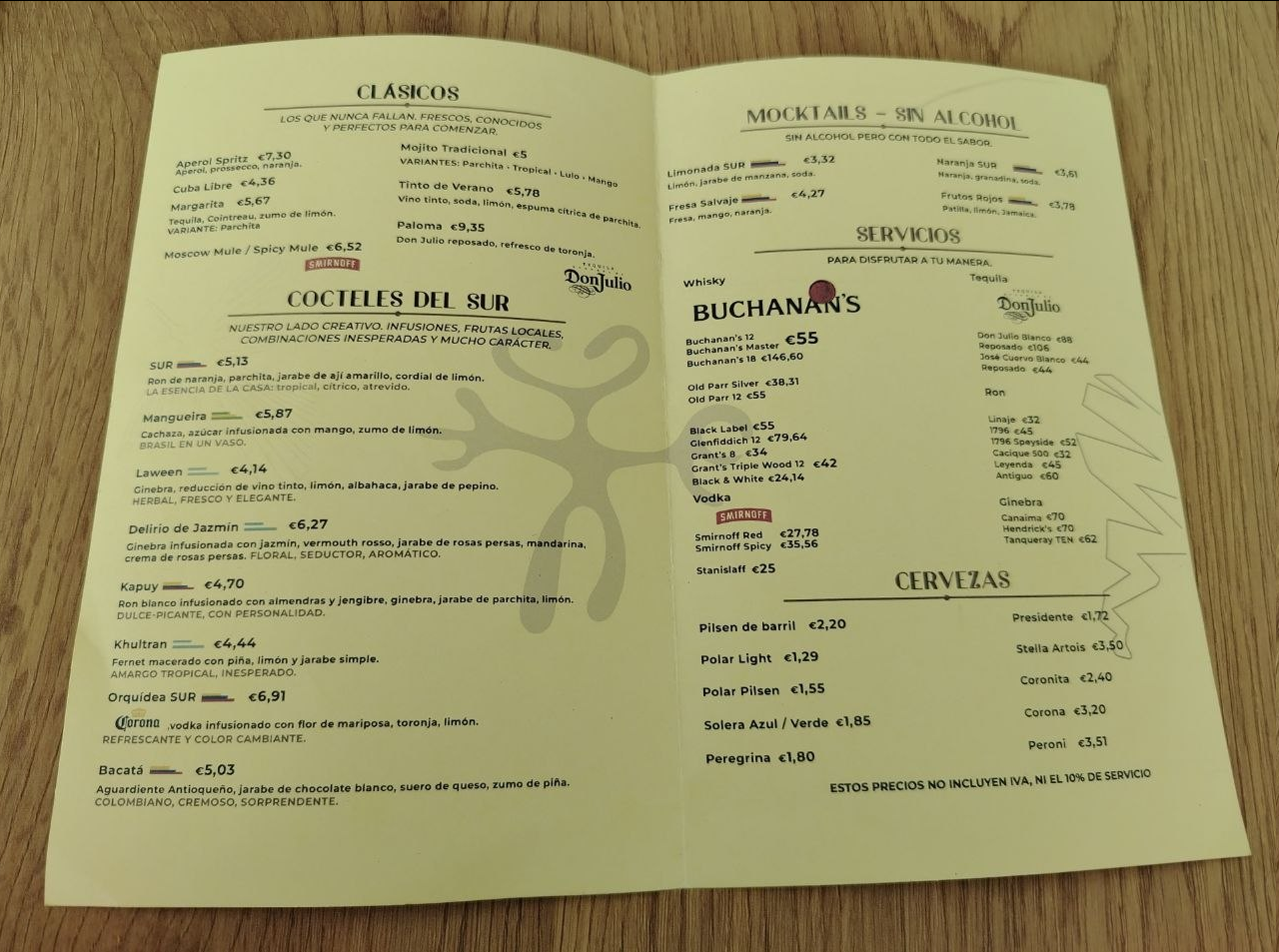 El menú de los platillos están muy bien organizado. Hay buenas propuestas entre pizzas y comidas típicas de otros países como el ceviche peruano o el asado argentino e incluso la bandeja paisa de Colombia entre otros. Pero la comida venezolana es el norte de todo el menú mas las combinaciones de los chefs, aquí les comparto el menú de los tragos o bebidas.