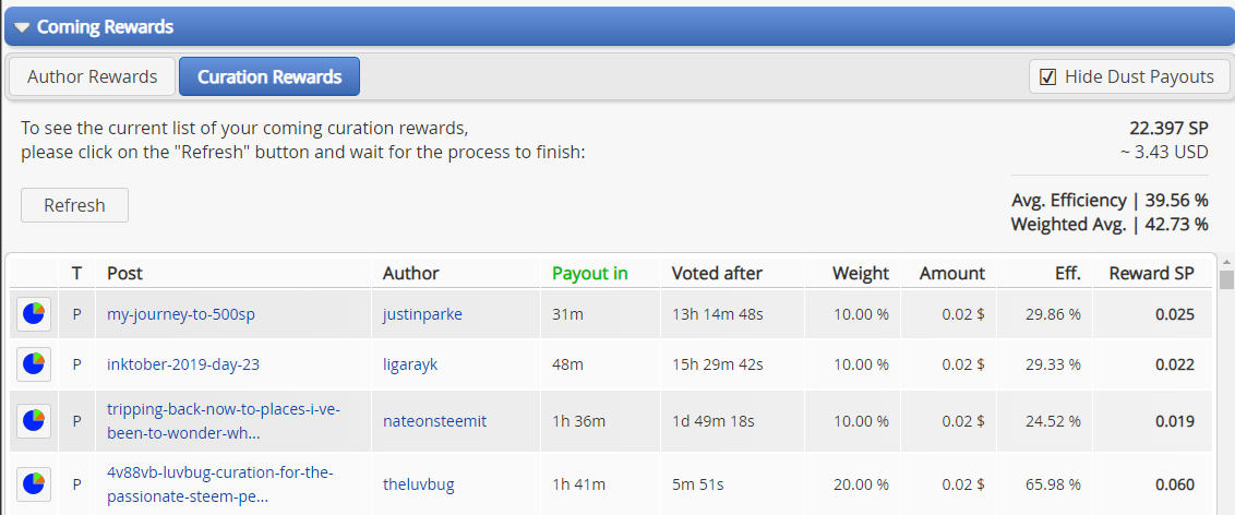 Lastly on #spud: This has taught me a lot about the benefits of powering up and when I joined the initiative, I also bought Steem with my SBD. I probably will again when I have enough to make it worth while. Doing that made a great deal of difference to where I can choose to put my vote. I've even delegated and leased some SP . I think I'm going to follow your lead, and @nickyhavey's advice, and rather than banking my Steem to power up on SPUD, I'm going to power up when the posts mature and then do a monthly tally. Why wait?