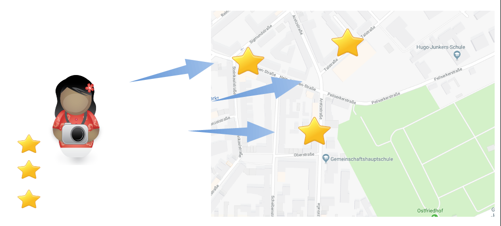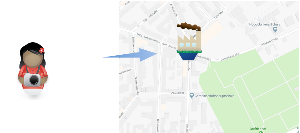A player starts with nothing but an app to collect items in his environment. If he has the first 5, he buys a plot of land. If he owns another 10, he builds a factory on it. The factory then produces one new item per day, which is then placed in one of the areas in the surrounding area that have become vacant. With further collected items the player can either enhance the factory (e.g. 50 items to double the production ) or build further factories in the surrounding area.