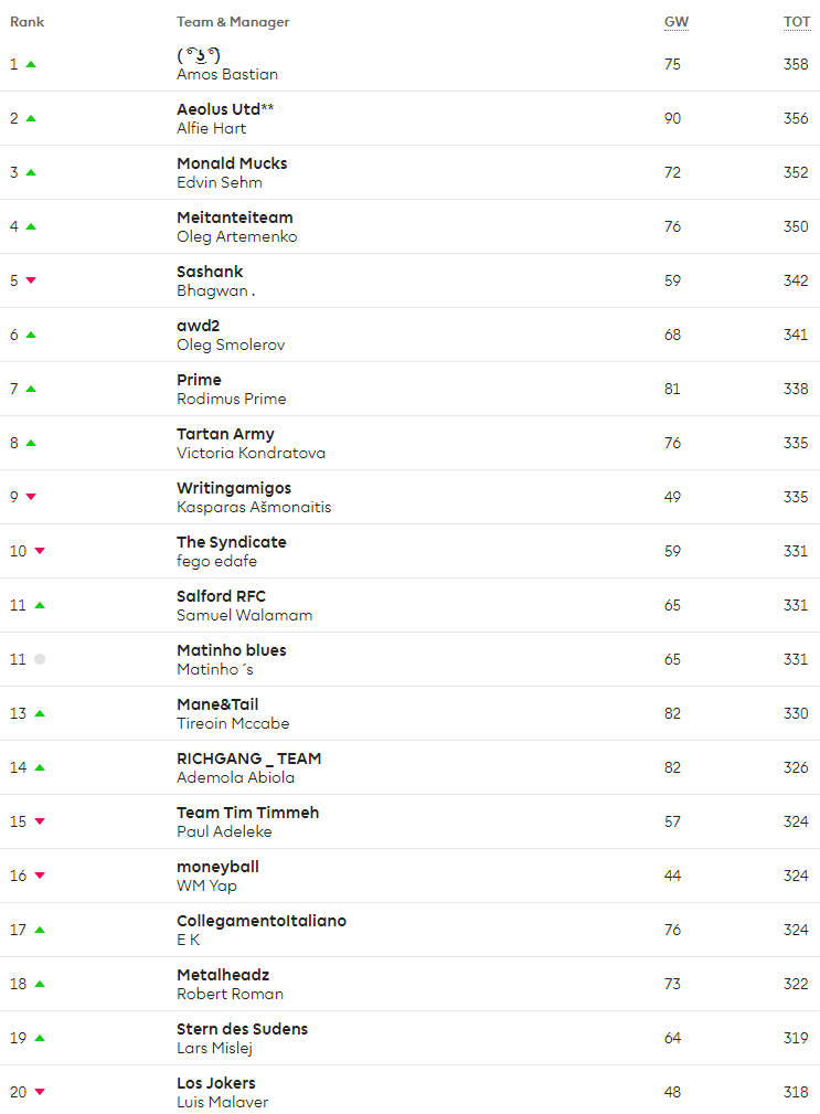 In our Steem Fantasy League we have got a new leader in Amos Bastian who managed 75 points which took his overall points to 358. The Overall rank for his team is 20,025. The highest score, 90 points, of the gameweek was set by two teams (“Aeolus Utd**” and “Red Devils”). Quite high scores taking into to consideration neaither manager had a really high scoring captain (Aguero and Pogba).Well done!