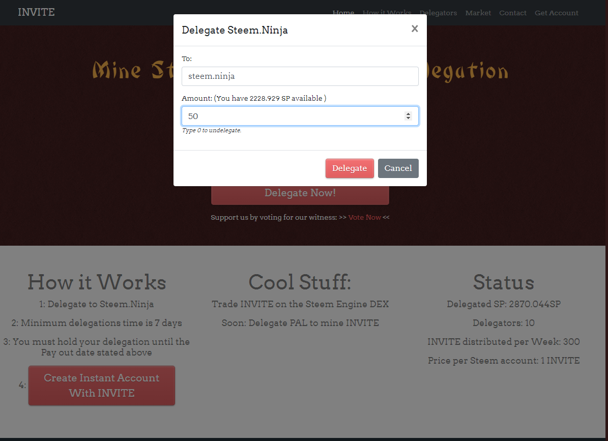 I just delegated 50 SP to steem.ninja and I calculate I will be getting roughly 5 Instant Steem Invites. Jun 24th delegation of 600Sp gets a user 63 Invites on July7,