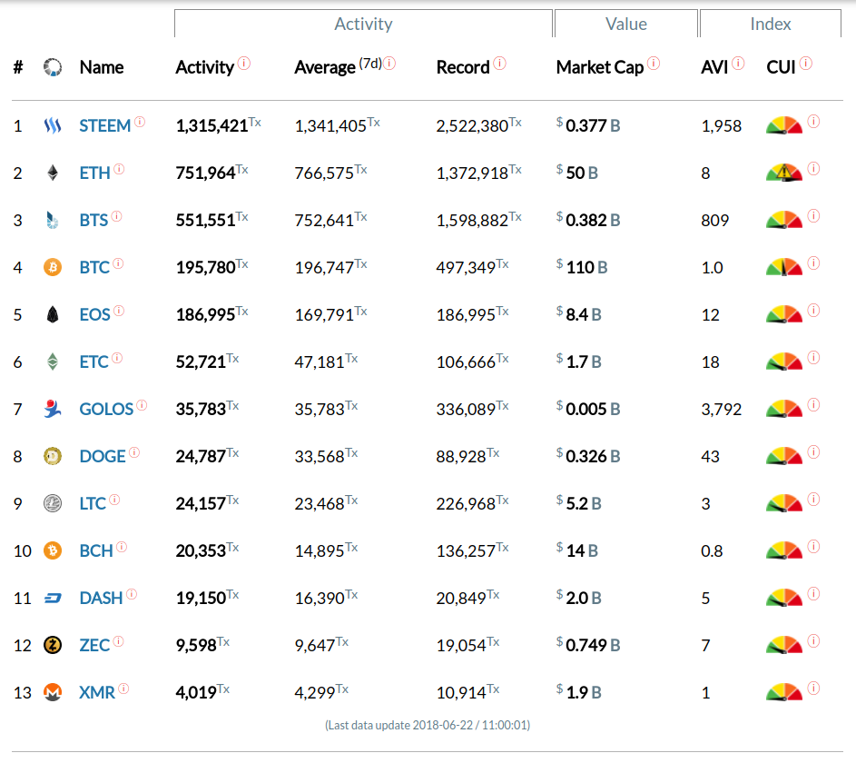 The Steem blockchain at 0.11% of capacity with number one highest activity.