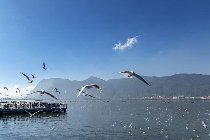 The view of glistening Dianchi Lake under the vast blue sky looks like out of a fairy tale, not to mention the Dai people's beautiful traditional buildings on the shore.