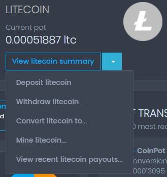 Now after you have accumulated some coins in your coinpot wallets, you can convert all your different coins to one specific coin by clicking on the dropdown arrow of any of the coins you have in your wallets on coinpot. See example below: