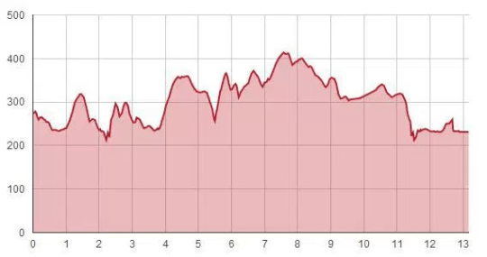 Here’s the elevation profile — it included a total of nearly 1000 feet of climbing.