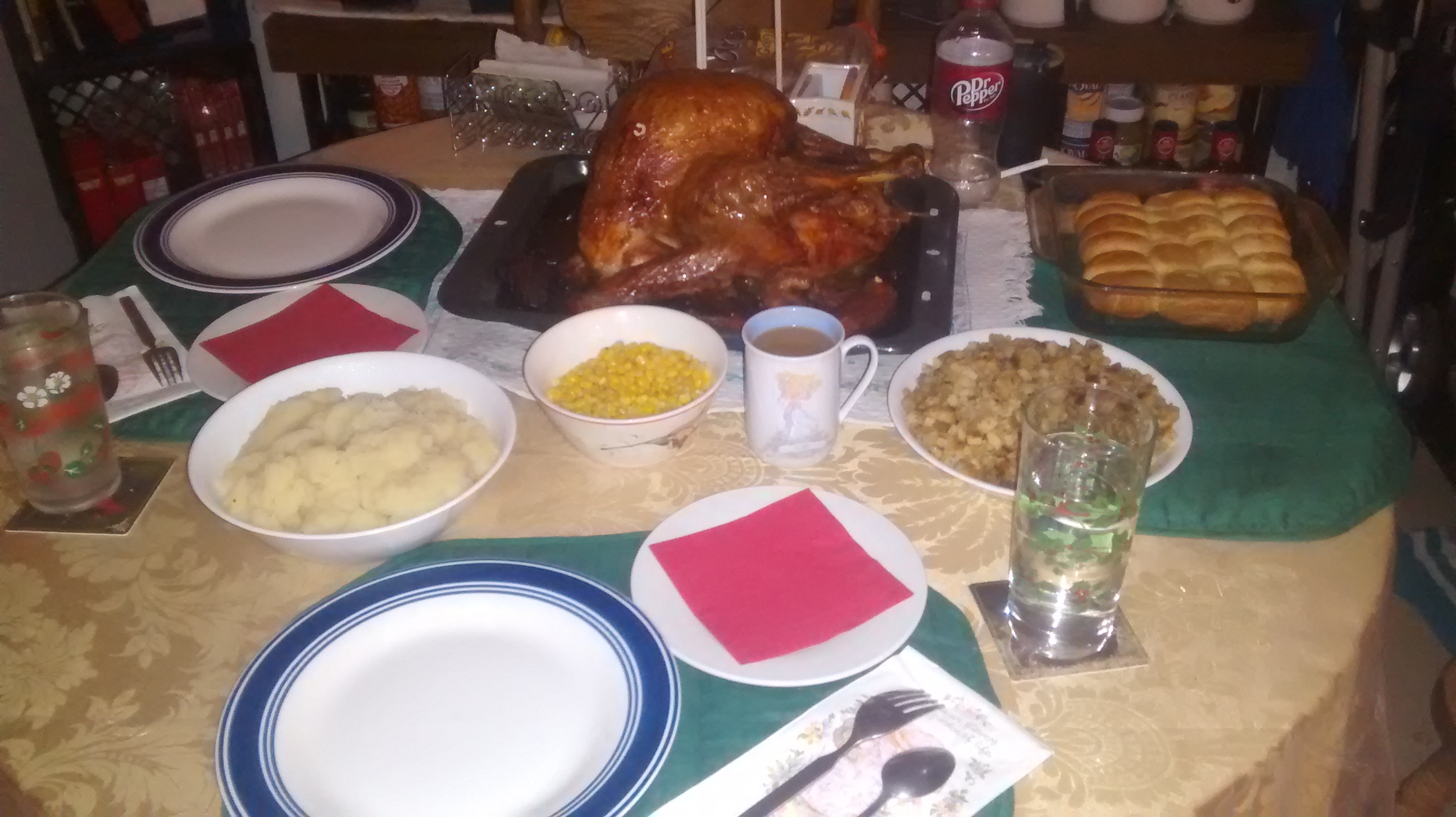 Home made stuffing, mashed potatoes, gravy, pepper buttered corn, and of course the turkey. Hope your dinner was bigger and better then ours.(2 people & 2 small dogs)