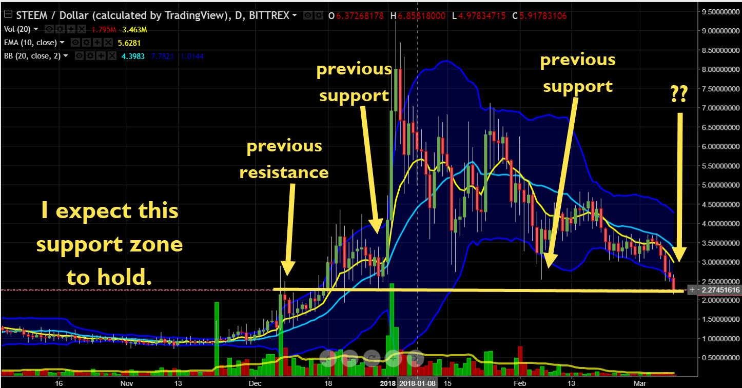 While I hardly ever post any Technical Analysis or charts, I wanted to share this one of the STEEM/USD chart. You can see that we are squarely on a support level and I've indicated a few previous touch points. I expect this zone to hold and is a great buying opportunity here. Remember that round numbers are also a favorite target for traders and Steem could easily retest $2.